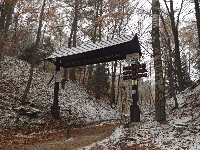 W mieścinie/wiosce pojawiają się już konkrente znaki obwieszczające, że kolorowe jeziorka tuż tuż. Okoliczne wzgórza coraz bardziej ośnieżone, mienią się to bielą to wciąż jesiennymi płomiennymi barwami. Woda z niewielkiego przydrożnego kanaliku zmienia barwę na piaszczysto-rdzawą, w końcu docieram na ziemię post-kopalnianą. Krajobraz raptownie przebiera się w zimowy płaszcz a przede mną ukazuje się brama Rudawskiego Parku Krajobrazowego i szereg podstawowych ostrzeżeń 😉