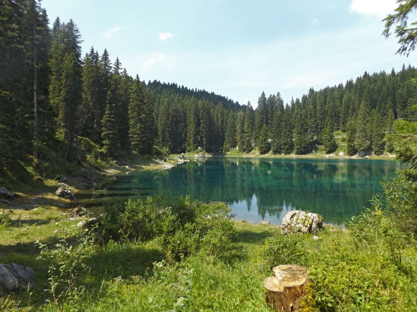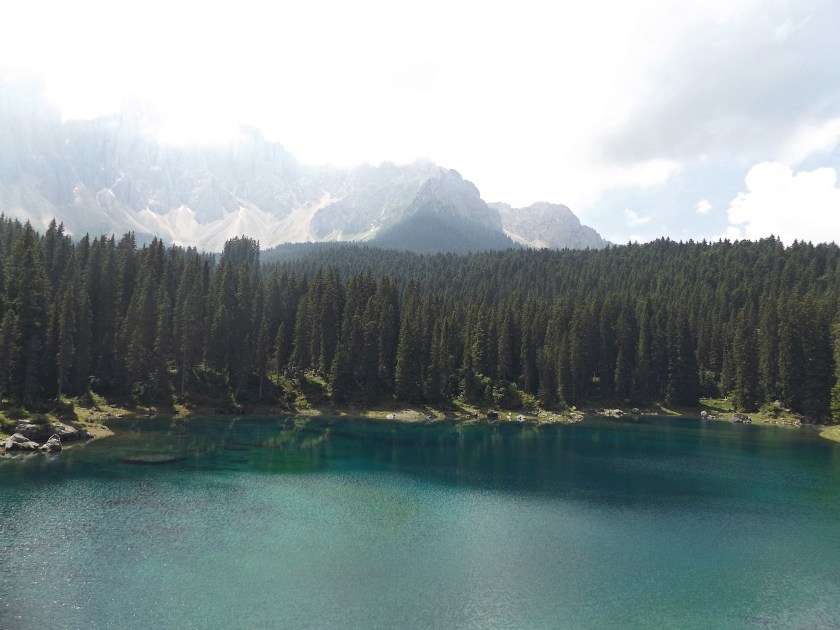 Nad jezioro jeździ autobus nr 180, start prosto z dworca w Bolzano – kurs trwa 45 minut. Wysiąść należy po przejechaniu Nova Levante, na niewielkim parkingu nieopodal budynku z pamiątkami oraz informacją turystyczną (plus dwa sklepy ze sprzętem do wędrówki w góry) – wielgaśny napis LAGO DI CAREZZA/KARERSEE nie pozwoli wam go ominąć. Stamtąd tak naprawdę wystarczy przejść jezdnię i jest się na schodkach prowadzących nad jezioro. Choć stosunkowo małe (niecałe 4ha), jest zaskakująco głebokie. Całkowicie dookoła poprowadzona jest ścieżka, tak więc nimfę można starać się dojrzeć z każdej strony. Ludzi niemały tłum, większość jednak idzie zgodnie ze wskazówkami zegara, dlatego idę pod prąd. Na niebie sporo chmur, do tego słońce jak tylko wychylało się zza zasłony dawało mocno po oczach, ‚wybielając’ wszystko tak, że górujące nad jeziorkiem masywy Latemar oraz Catinaccio ledwo można było rozpoznać.