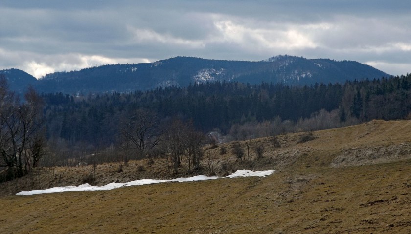 W drodze powrotnej ku „Andrzejówce” chmury zaczęły nieśmiało przepuszczać słońce przez co w okolicach Przełęczy pod Waligórą postanowiłem odbić w stronę Suchawy, drugiego najwyższego szczytu gór Kamiennych. Był to jedyny fragment dnia w którym cały czas szedłem w śniegu, mokrym, ale śniegu. Łagodne wejście pozwala z innej perspektywy spojrzeć na najwyższy punkt pasma a także dostrzec wcześniej zdobytego Szpiczaka.
