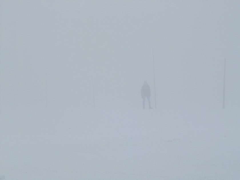 O dojściu do Ceskiej Boudy również dowiaduję się z tablicy, widoczność minus milion, ledwo co widać następną tyczkę. Wciąż jednak mam nadzieję „o 13 będzie piękna pogoda”, głupi ja 😀 Do Kotłów warunki podobne, ciężko o wyłapanie jakichś charakterystycznych punktów, idzie się od tyczki do tyczki. Na ostatnim kawałku można było poczuć się jak na morzu, wokół „sea of clouds” a każdy mijany narciarz wołał „Ahoj!”. Mimo wszystko marsz w takich warunkach jakoś tak uspokajająco wpływa na człowieka, nadzwyczaj dobry humor dopisuje.