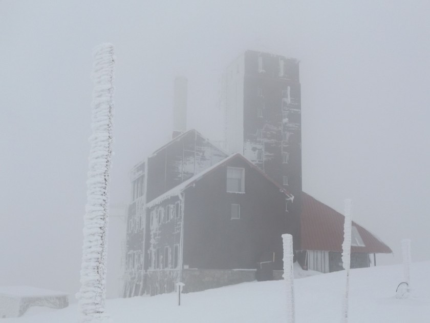 Po kilkudziesięciu metrach mgła się nasila, po chwili jestem ja, tyczka, okoliczne drzewo i mleko dookoła. W oddali słychać narciarzy, serce bije mocno i dyktuje tempo marszu. Wspinam się dalej, widoczność meadnruje pomiędzy „widzę jedną a cztery tyczki”, im bliżej jednak Szrenicy tym lepiej. Tuż pod szczytem znów atakuje mgła, dziś użytku z punktu widokowego nie będzie.