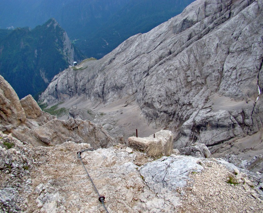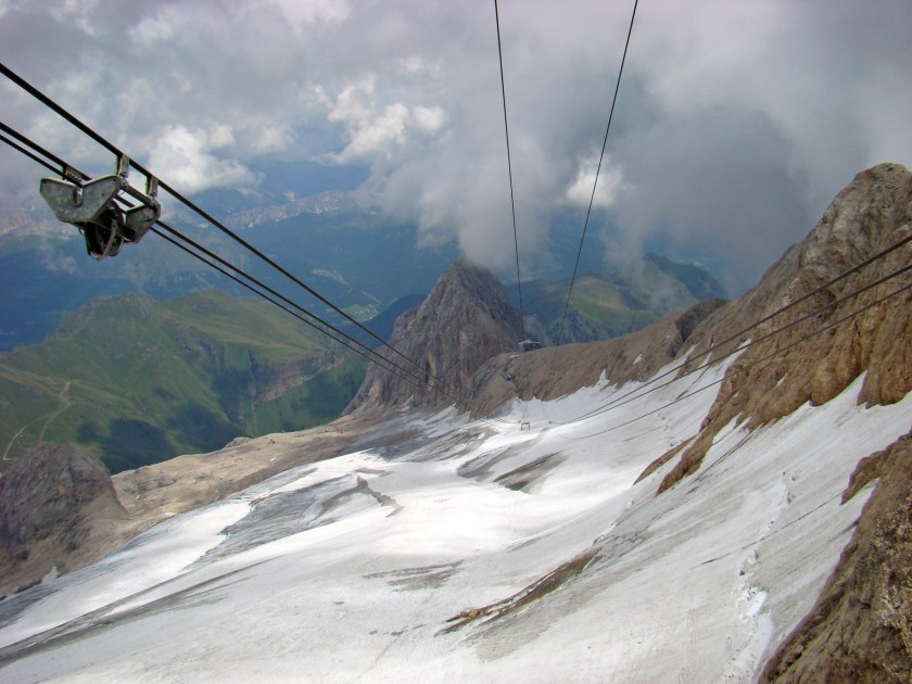 Kolejka wspina się z 1425 metrów na wysokość prawie 3300! Końcowa stacja niemalże dociera do szczytu Punta Rocca, drugiego najwyższego w masywie, temperatura z 20 na dole spada do 5, w ruch idą kurtki, czuć wysokość. Wokół masa chmur, najwyższy szczyt Punta Penia, schowany we mgle.
