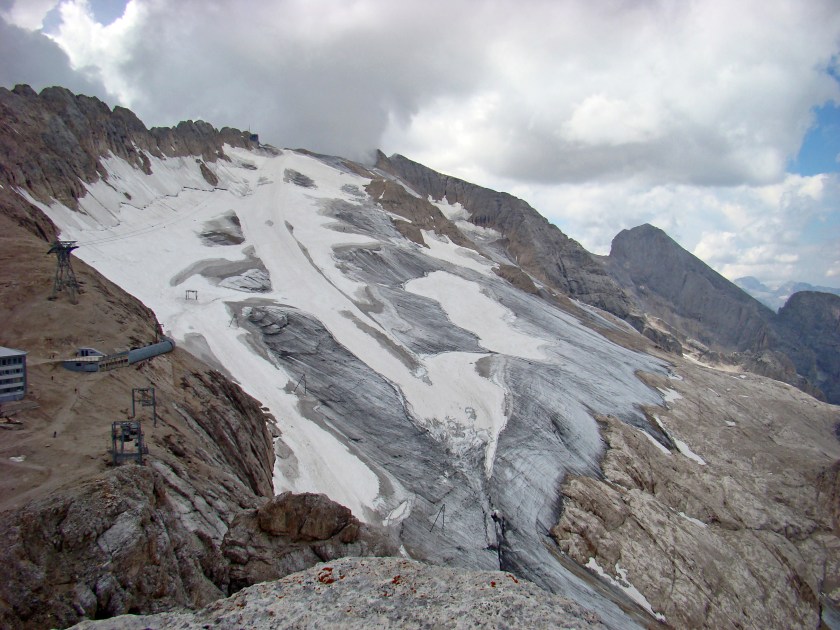 Budynek kolejki wyróżnia się na tle skał i nie grzeszy urodą. A my jak na wytrawnych alpinistów przystało 😉 wychodzimy na lodowiec, którego jęzory rozpłaczone pod granią Ombretta ciągną się do wcześniejszej stacji położonej tuż pod Punta Serauta na 2850 metrach.