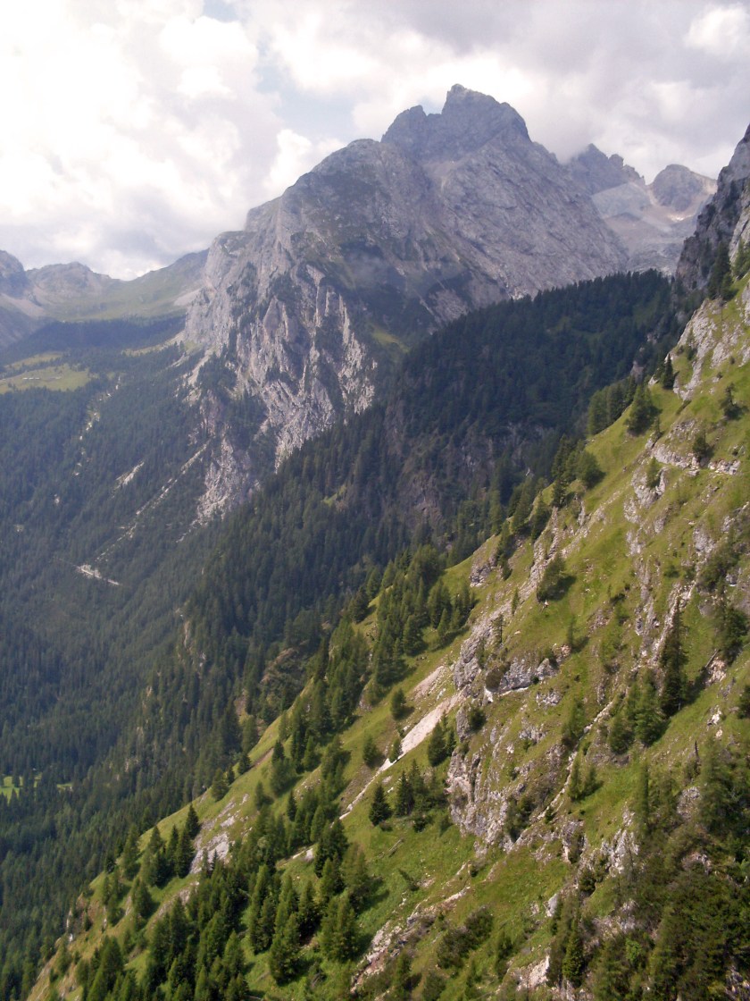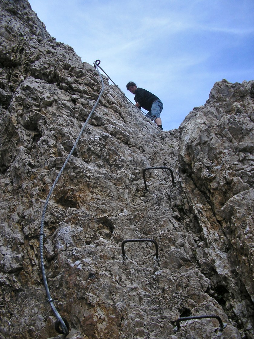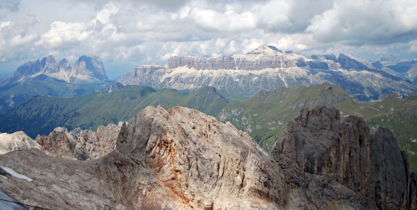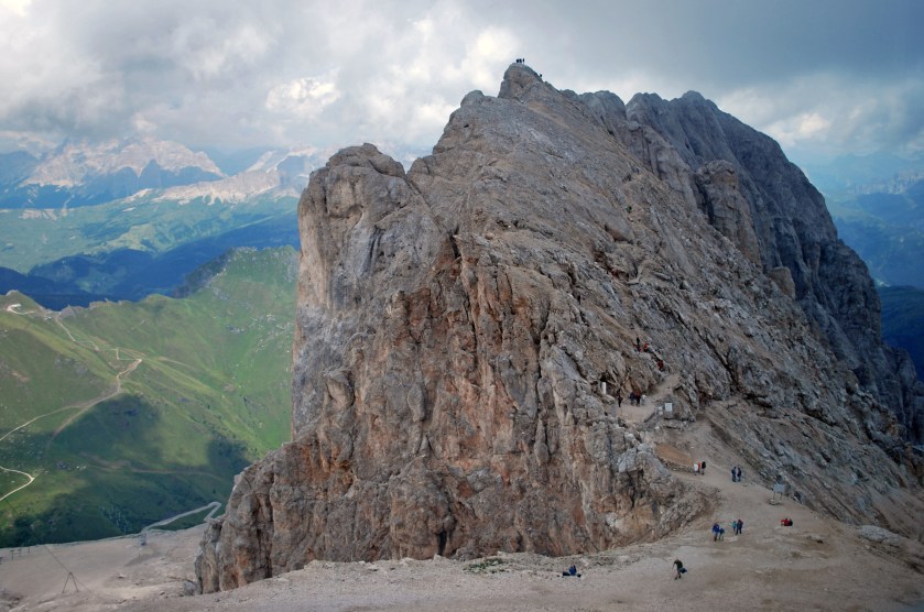 A widoki są przednie, w dobrą pogodę – a za taką uznaliśmy już pewne rozejście się chmur – zobaczyć można to co w Dolomitach najlepsze: potężny zwarty masyw Sella z charakterystyczny spiczastym czubkiem szczytu Piz Boe; oraz nie mniej charakterystyczny masyw Sassolungo. Przy naprawdę klarownej widoczności Alpy w tle również nie powinny stanowić problemu dla wzroku! Inna rzecz, że patrząc na resztę grani człowiek nabiera do żołnierzy nań walczących i zakładających tamtejsze ferraty niezwykłego szacunku, abstrahując od całej reszty.