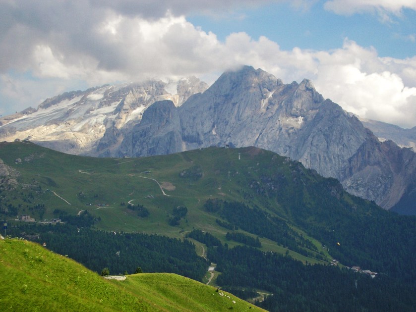 W każdym razie, już w fazie powrotnej za cel obraliśmy potężny masyw Marmolady, najwyższego szczytu Dolomitów. Z racji postury (3324 m.n.p.m.) nawet nie myśleliśmy o tym by spróbować wejść, ba, nawet gdybyśmy mieli dwa dni to i tak by nam to do głowy nie przyszło, bo na szczyt prowadzi seria via ferrat, ze sławną Ferratą Eterną na czele – a jest to ponoć jedna z najbardziej wymagających ferrat w całych Dolomitach.
