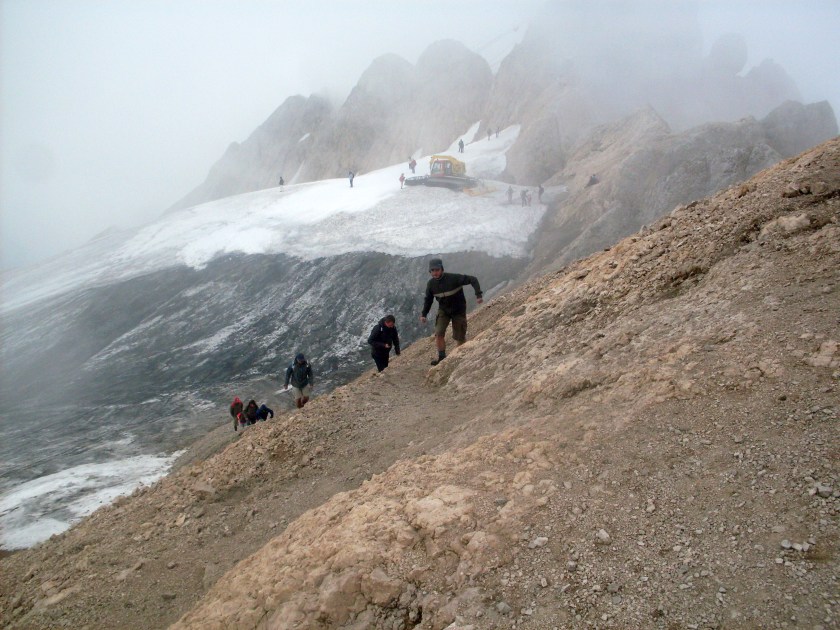 I tam też się udaliśmy, w tempie mieszanym, gdyż trasa w zimie wykorzystywana przez narciarzy latem ma miejsca gdzie trzeba się skupić, ma też takie na które wchodzić wręcz nie wolno, bo można doprowadzić do oberwania nawisów. Co ciekawe to właśnie od lodowca i jego odbicia w świetle nazwę wzięła góra – w języku ladyńskim Marmolada oznacza „błyszczeć”.