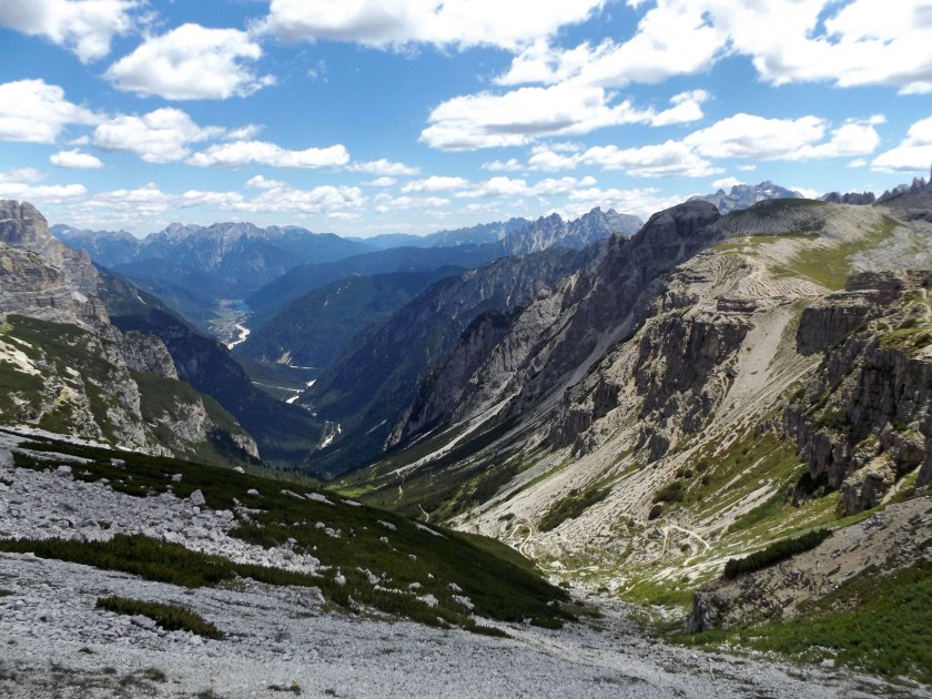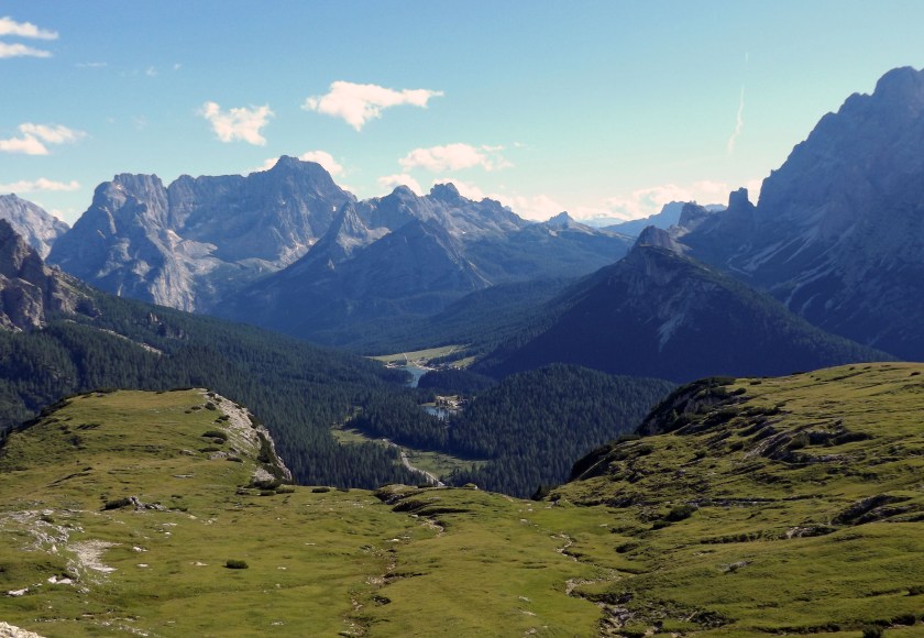 Stając plecami do pionowych skał otwiera się przed nami długa dolina zakończona turkusowym jeziorem w Auronzo di Cadore.