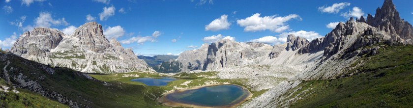Po dojściu do schroniska trafiamy na kolejną kapliczkę oraz większą chatkę, niezwykle fotogenicznie korespondującą się z Monte Paterno. Siadając w cieniu domku naszym oczom ukazują dwa niewielkie wielokolorowe jeziorka, Laghi dei Piani. W tle słychać pobrzękiwanie krowich dzwonków. Mućki pasą się nieopodal w dolince Rimbon oddzielającej masyw Tre Cime od Sasso di Sesto i pozostałych północnych szczytów.