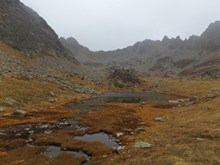 Po półgodzinie docieramy do „celu” wyprawy. Jeziorka mylnie wzięte przeze mnie za bliźniaki Siscaro znajdują się na niewielkim wypłaszczeniu przywodzącym na myśl zminiaturyzowaną dolinę Pięciu Stawów, taką w bardzo jesiennych barwach.