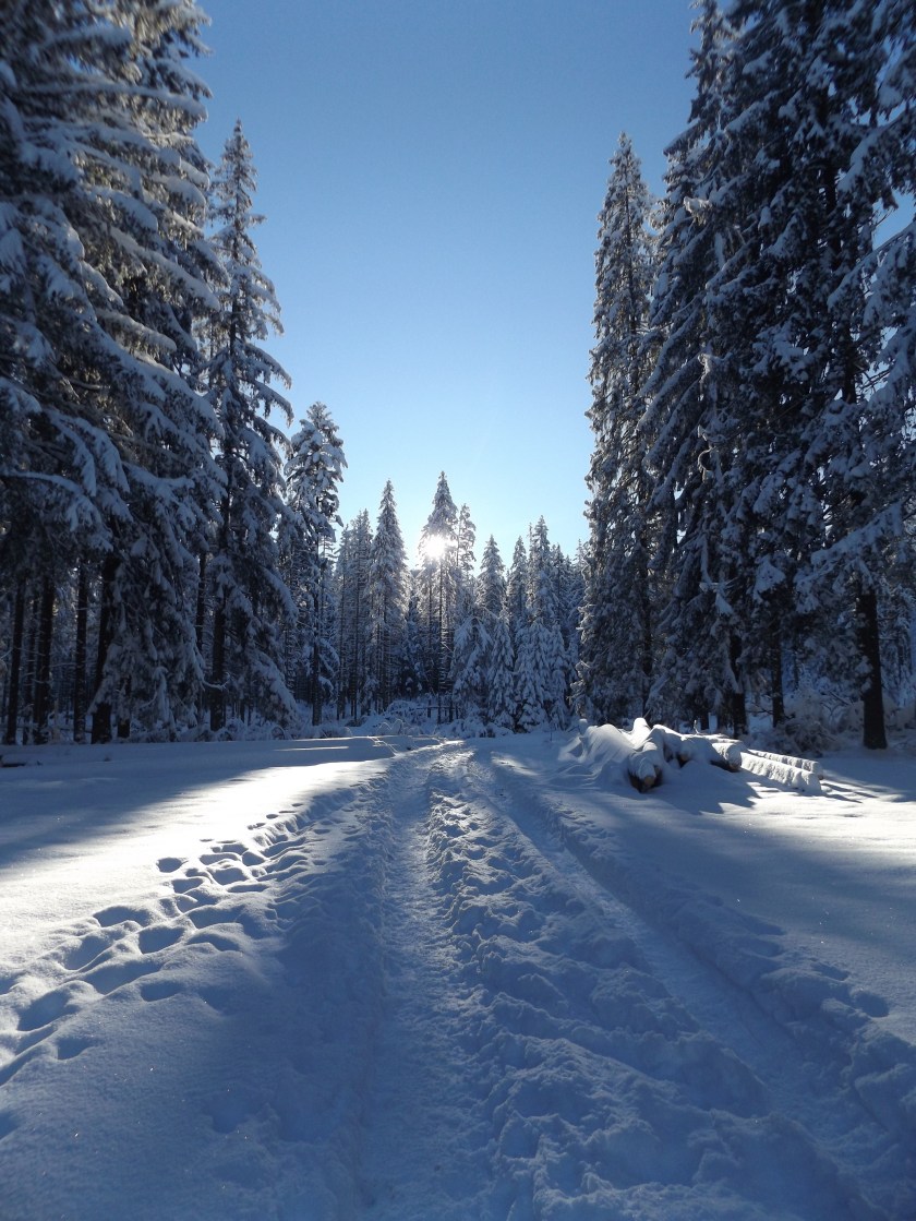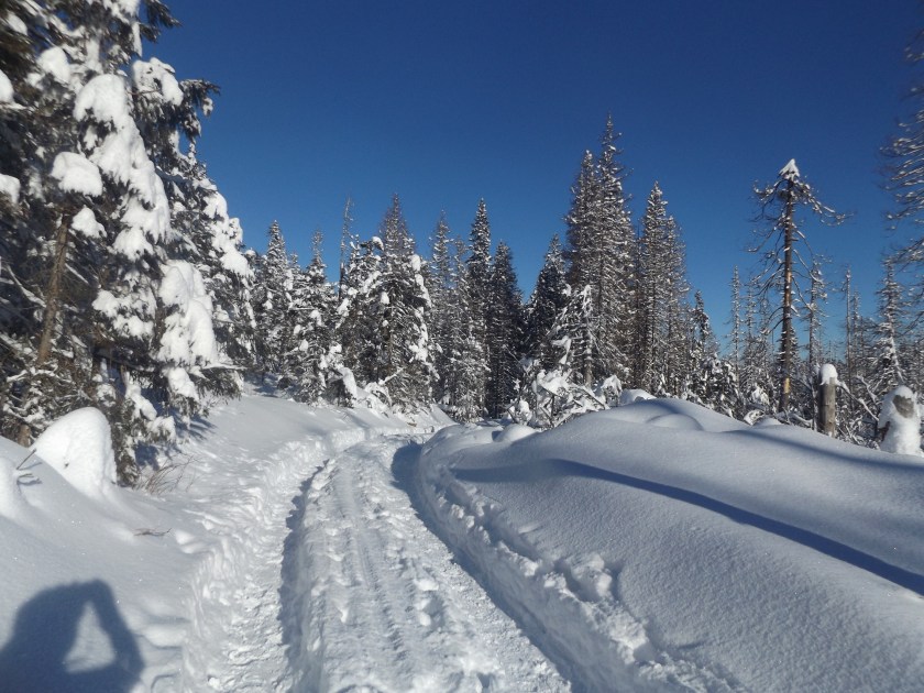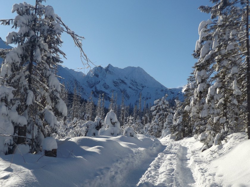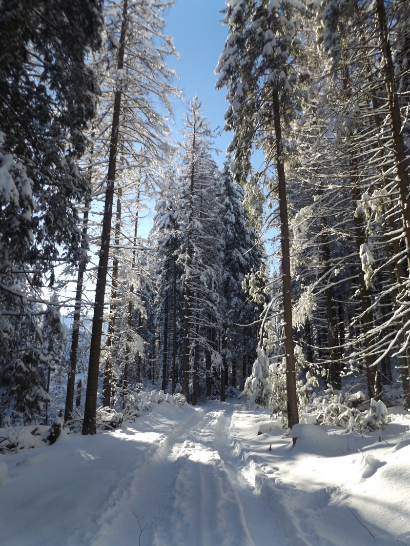 Szlak jest prosty i przyjemny, delikatnie wznosi się ku górze. Śniegu niemało, w większości już starego i ubitego, przykrytego jednak lekką warstewką świeżego. Raczki na razie pozostają w plecaku.