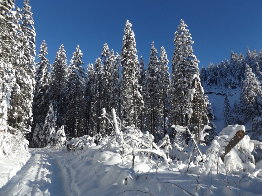 Kiedy docieramy do granicy lasu pozostaje nam już tylko szybki „bieg” w dół, bez raczków zalecałbym nie tyle co ostrożność ale po prostu powolny marsz, śnieg tam w wielu miejscach był dość zmrożony co w zestawie z lekką świeżą warstwą pozwalało na częstsze niż zwykle ślizganie się 🙂