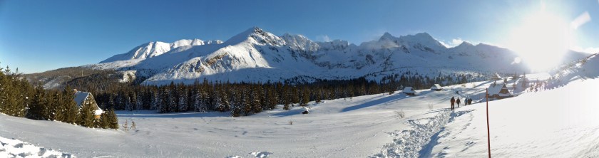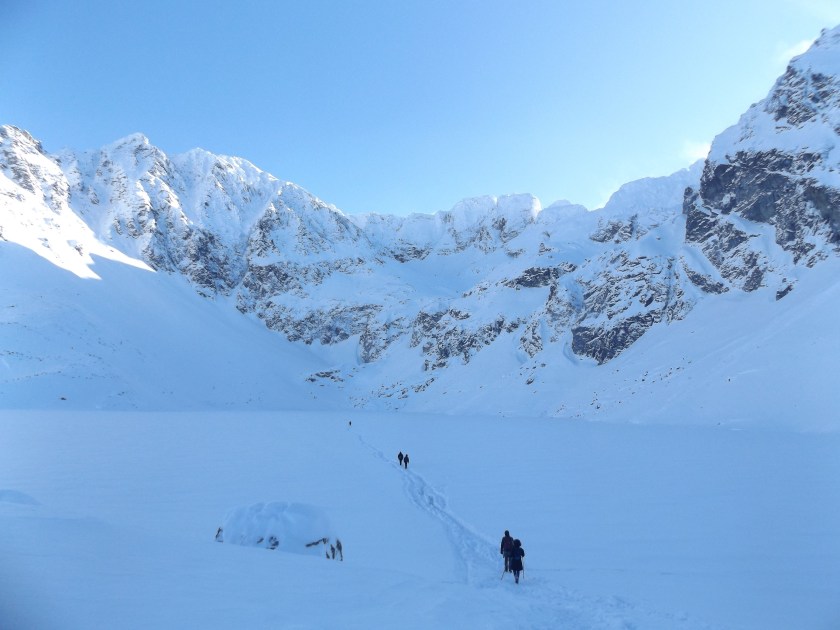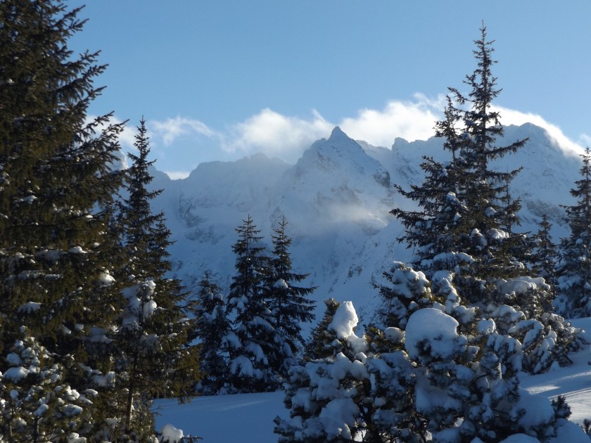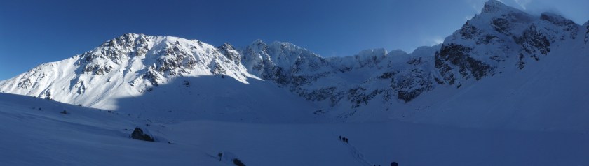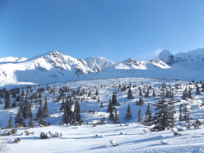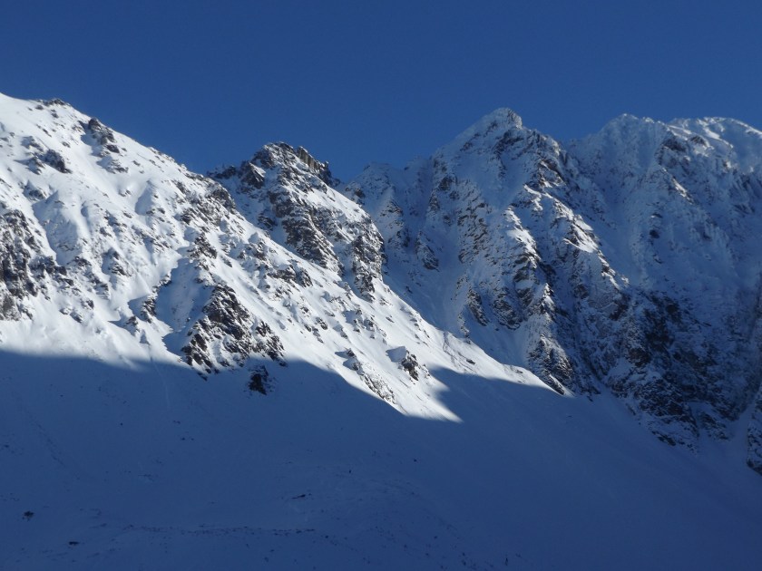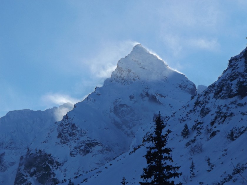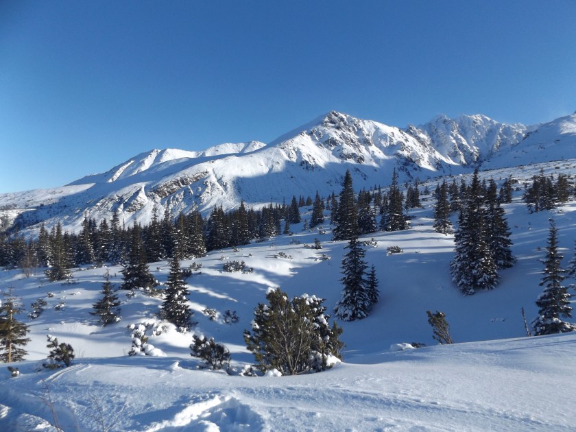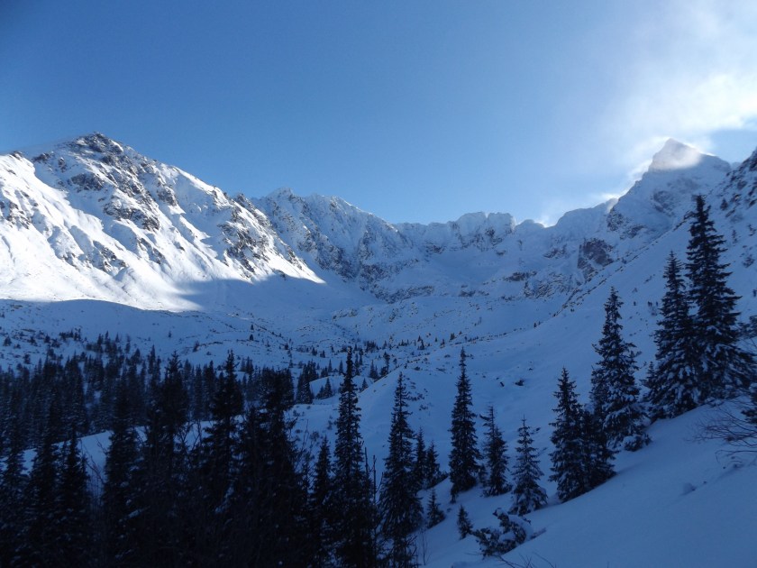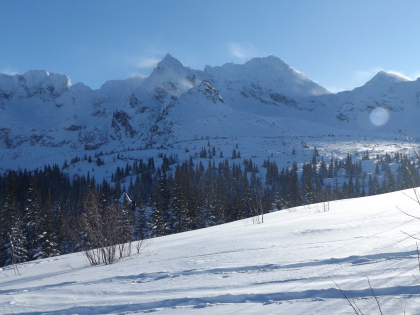 Przykryte grubą warstwą śniegu Kościelce, Świnica, Granaty, Kozi Wierch… można by tak jeszcze chwilę wymieniać. Choć w dolinie jest spokojnie to na szczytach widać szalejący wiatr przedmuchujący pokaźne ilości śniegu. Szczyty lśniły w słońcu, błękitne cienie długo kładły się na stokach.