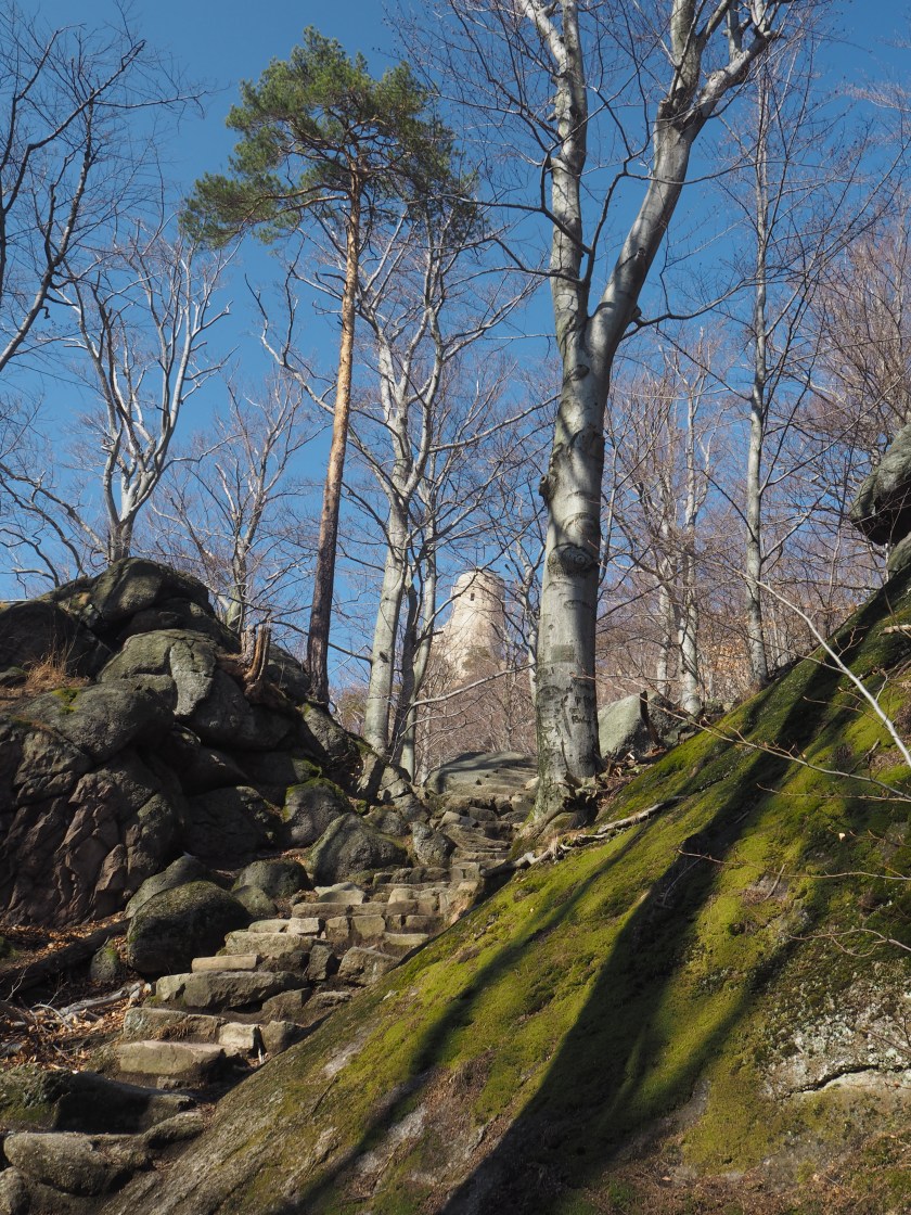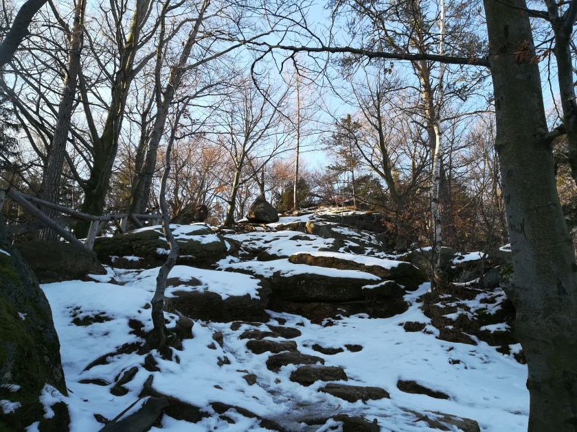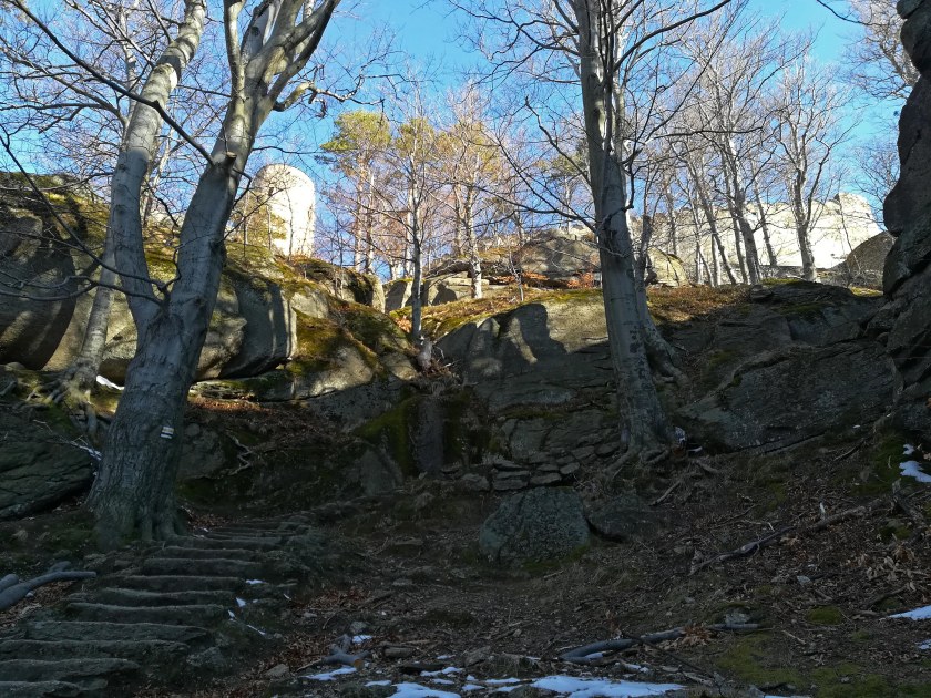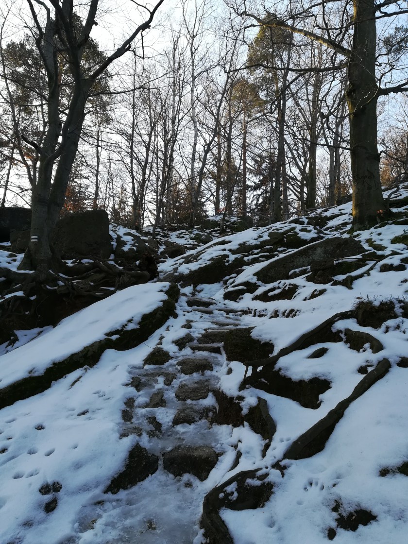 Z Sobieszowa do zamku prowadzą dwa szlaki, czerwony i czarny. Szybki wybór i idziem w czarne. Prowadził on przez Zbójeckie Skały, których nazwa dawała obietnicę dobrej zabawy, z drugiej jednak strony ostrzeżenie przed oblodzeniem od razu dało do myślenia. Raczki nie czekały i od razu wylądowały na girach. Jak się okazało wzięcie ich było idealną decyzją, do południa każde podejście bez nich byłoby mozołem niewysłowionym.