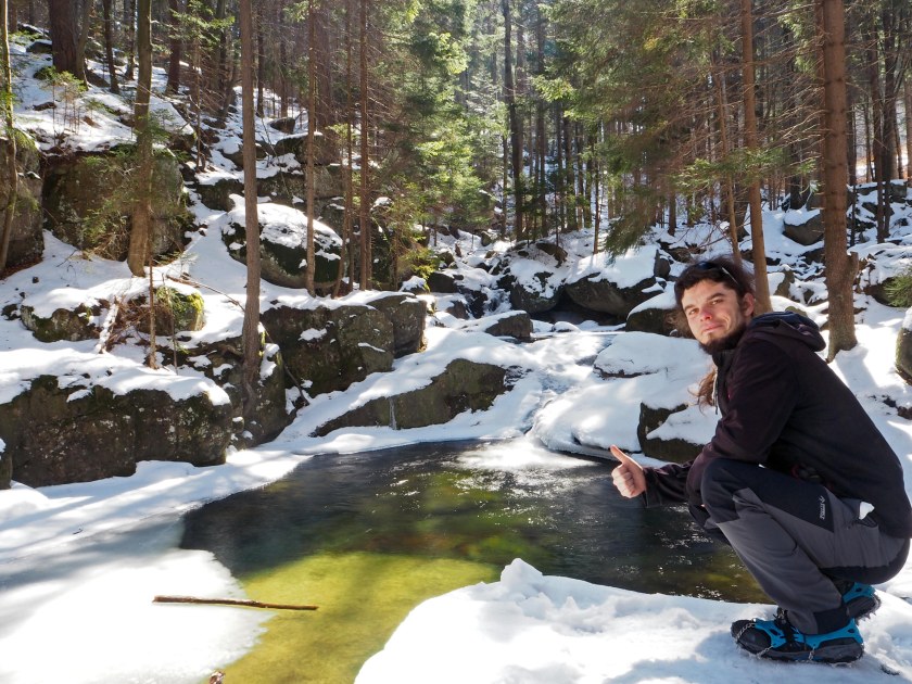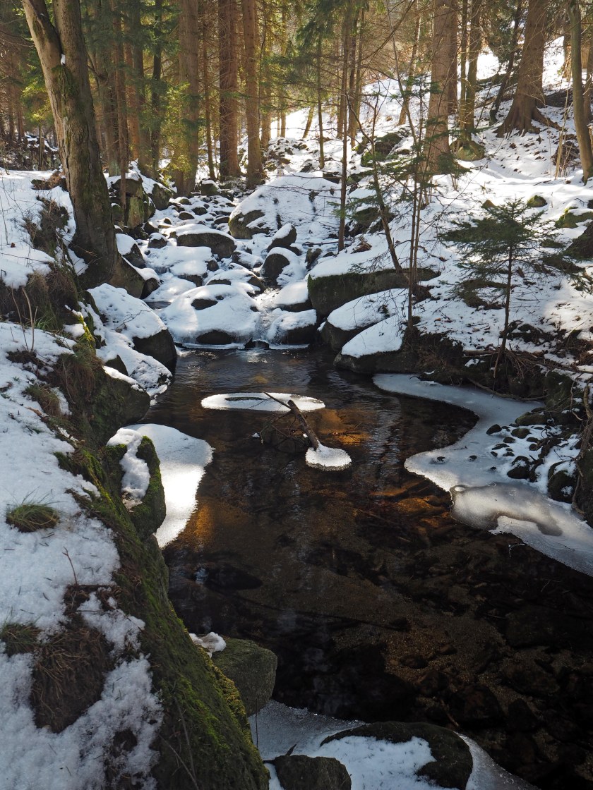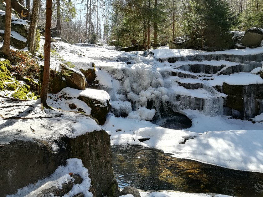 Trzeci najwyższy po naszej stronie Sudetów wodospad wciąż uwięziony pod niemałą warstwą lodu, w zimowym anturażu prezentował się wyśmienicie, choć to paręnaście metrów wyżej skąpane w słońcu oczko wodne na rzece Podgórna robiło robotę.
