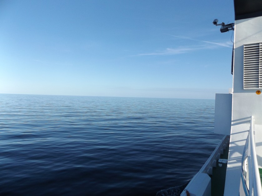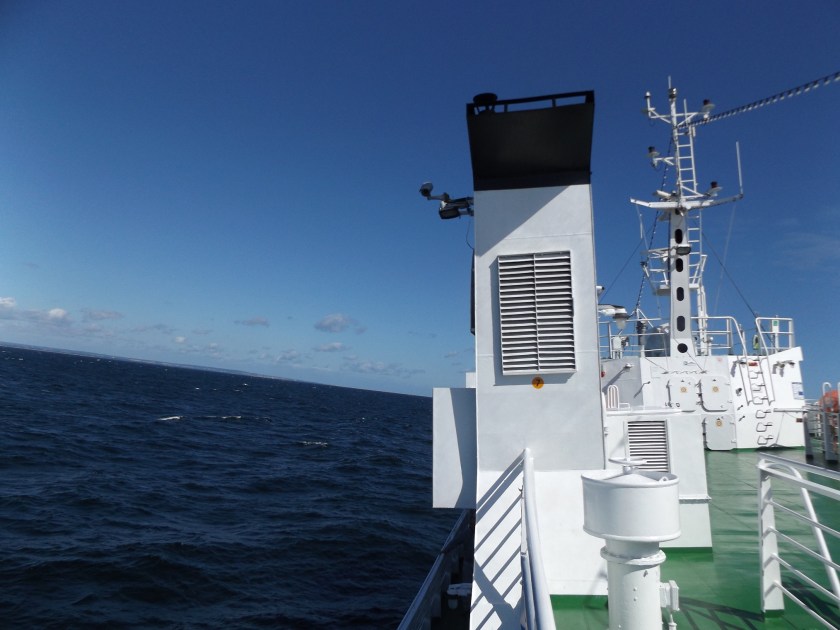 MS Jantar którym płynęliśmy to 3 pokładowy katamaran. Ogólnie to fajna łajba, załoga profesjonalna, ale… jak przychodzi wiatr w sile 3-4-5 w skali Beauforta to nie ma zmiłuj, trzeba przygotować się na mocne bujanko i obrazy jak z katastroficznego filmu sci-fi o zabójczym wirusie na pokładzie promu :> Żeby nie wdawać się w szczegóły, większość pasażerów dość mocno odczuła czym jest choroba morska, WC oblegane było non stop a foliowe woreczki miały niezwykłe używanie. Kiedy jednak ułożyłem się jak zwłoki na podłodze, pozycja boczna ustalona uratowała mi życie 😛 Tylko Bartu niewzruszenie z uśmiecham na ustach paradował po całym promie jakby nigdy nic.