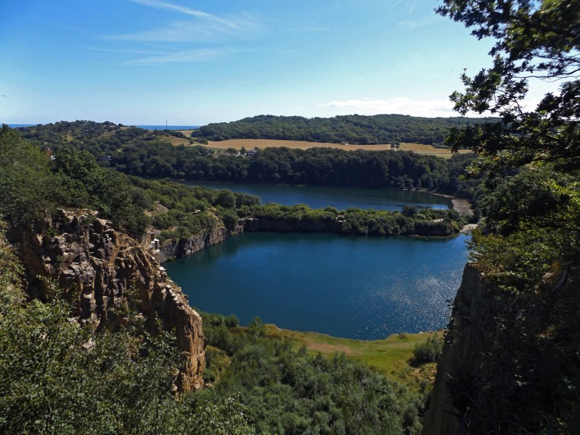 Wspinamy się szybko, po drodze mijamy wiele owiec, których popas tam nie jest niczym dziwnym. Naszym oczom towarzyszy niezwykły widok, stajemy na krawędzi starego wyrobiska. Granitowe pionowe ściany opadają wprost do sztucznego jeziora Opalsø, tworząc zapierający dech w piersiach widok! Naprawdę, to jedno z must see na wyspie. Tuż obok Opalsø znajduje się największe jezioro Bornholmu, naturalne, polodowcowe i co pewnie was zaskoczy nazywa się Hammersø, w końcu mało co w tej części wyspy posiada w nazwie człon „hammer” 😉