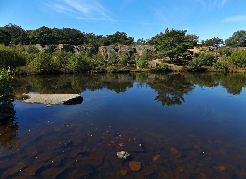 To wszystko jednak znajduje się poniżej, wróćmy na górę. Z miejsca z którego podziwiać możemy oba jeziora żabi skok mamy do małego stawu z kapitalnym kamienny dnem i mnóstwem czerwonych i żółtych rybek. Najbliższa okolica jest tak spalona słońcem, że naprawdę trudno w pierwszej chwili przypisać ją do Danii.