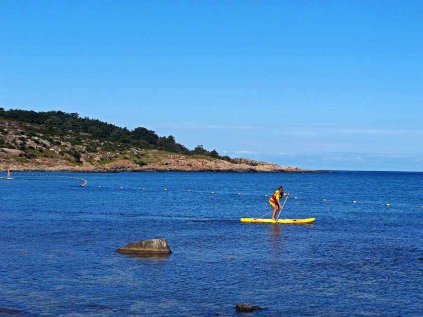 Tuż koło portu mamy przyjemną piaszczystą plażę, nad którą wznoszą się niewysokie skaliste wzgórka. Co zaobserwowaliśmy, bardzo popularne są tam SUP (Stand Up Paddle) czyli pływanie na desce z wiosłem, w sporej zatoczce Bałtyk jest spokojny przez co skutecznie można pobawić się w naukę tegoż.