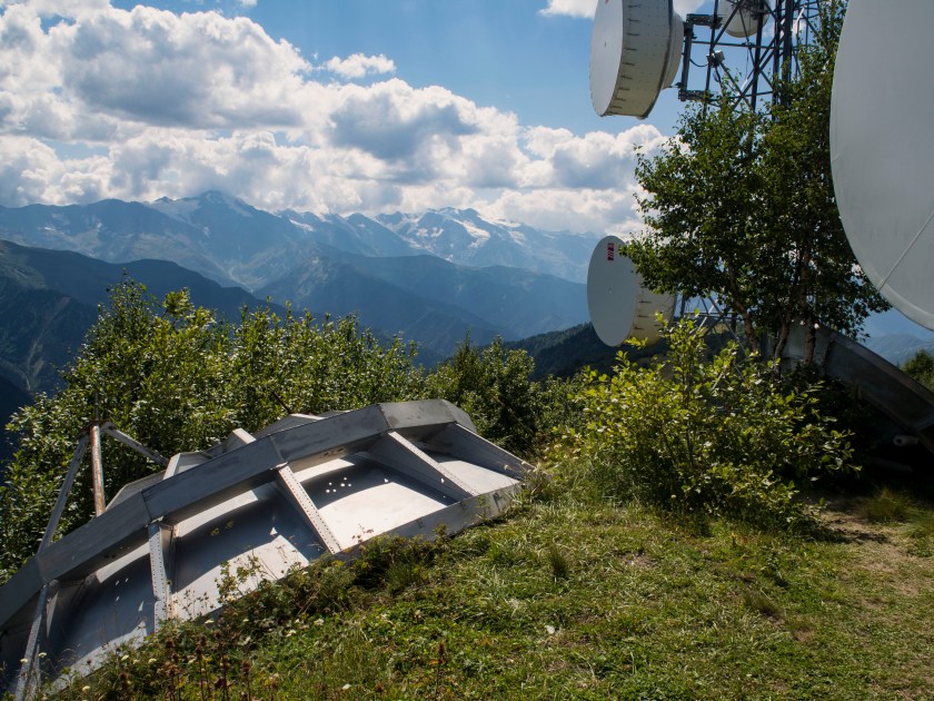 Ścieżka początkowo biegnie wśród drzew, szybko jednak wchodzimy na halą z której widać charakterystyczne wzgórze i nadajniki. W tle schowany w chmurach masy wTetnuldi. Szlak tak wije się, znika w lasku, to znowu pojawia. Na chwilę rozchodzi się na dwie ścieżynki by po chwili znów się zejść.