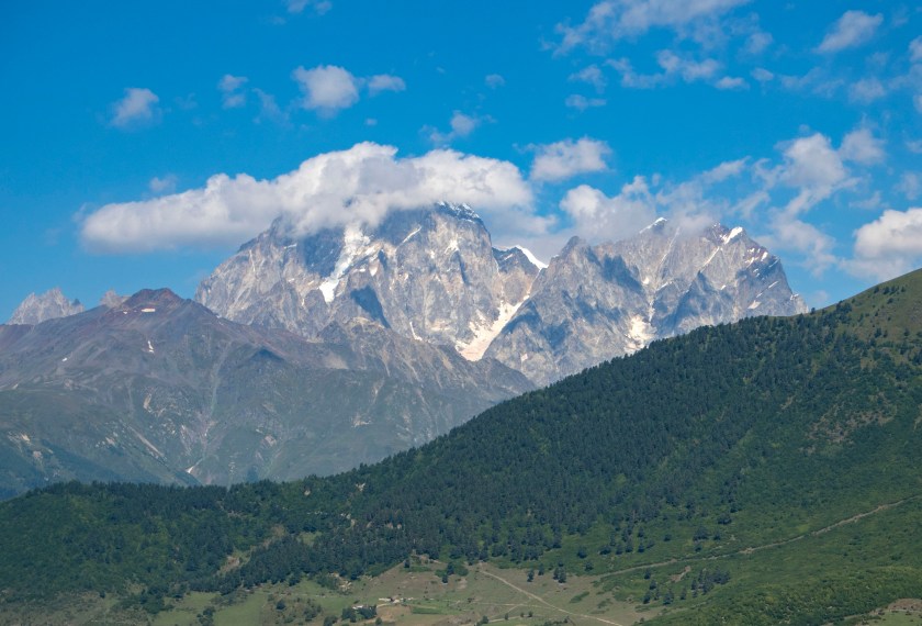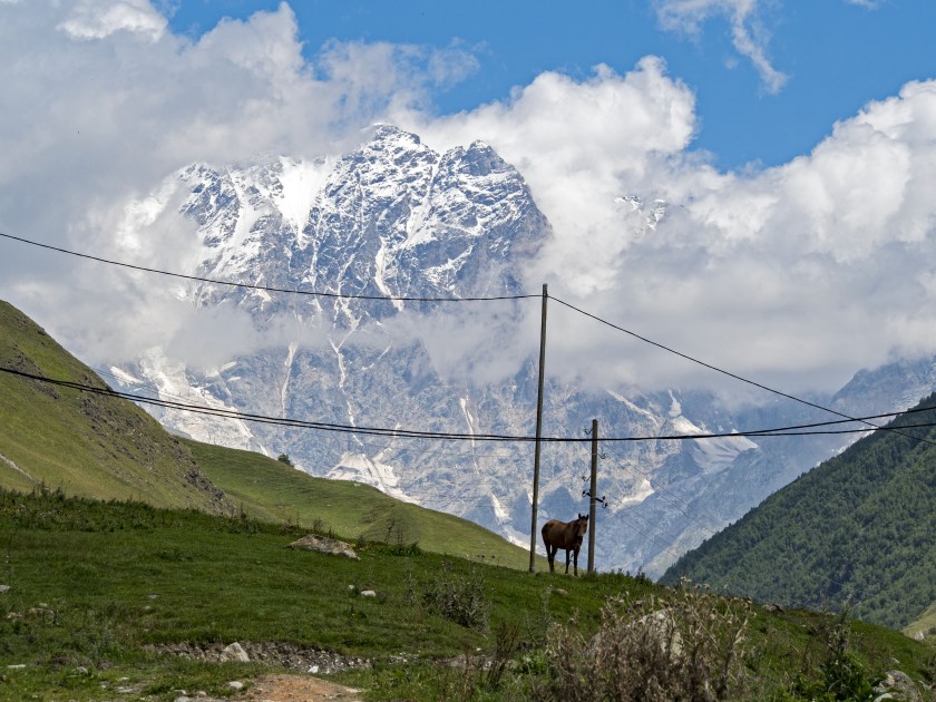 Tym jednak co najbardziej mnie ciągnęło do Ushguli były natura. Nigdzie indziej w Swanetii nie czułem jej majestatu tak dobitnie. Potężne lodowe ściany Shkhary i okalających szczytów potrafią zrobić wrażenie na najbardziej wymagających. Najwyższa góra Gruzji cały rok otulona lodowcami, latem najmocniej odcina się od zielonej doliny rzeki Enguri.