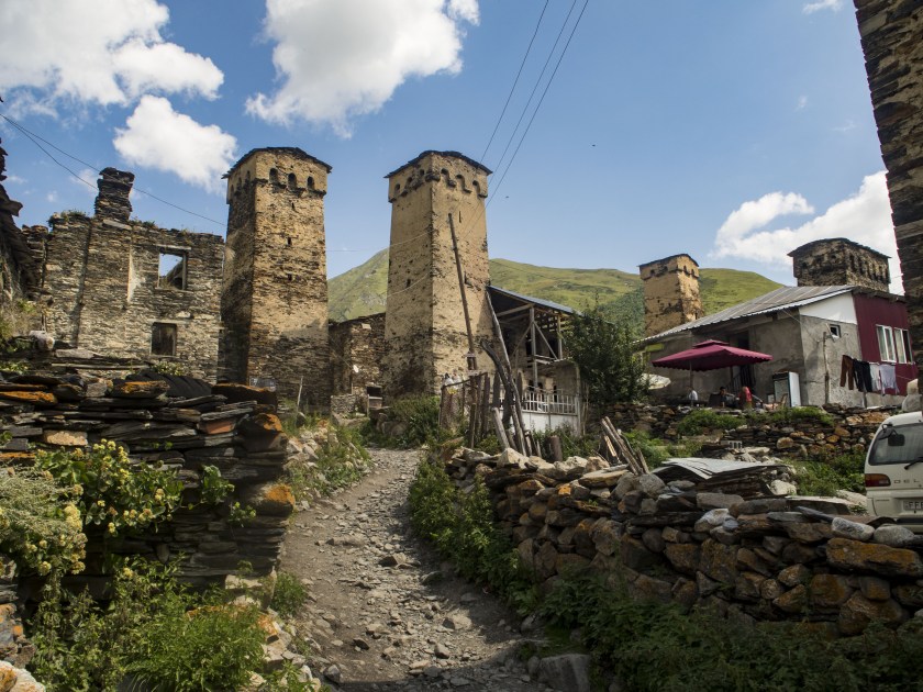 W Chazhashi, jednej z wiosek składających się na Ushguli znaleźć można 13 takich wież, jak i ruiny XI i XII wiecznych kościołów oraz zamku. Obecnie znajdują się one w dość opłakanym stanie, a to wszystko wskutek wielkiej lawiny z 1987 roku. W pozostałych 3 wioskach znaleźć można kilkadziesiąt wież oraz chat z kilkusetletnim stażem. Część z nich cały czas znajduje się w dobrym stanie, jednak pewien procent zdaje się już czekać na ostatni podmuch wiatru, który zakończy ich żywot… Przechadzając się wąskimi uliczkami pomiędzy tymi wiekowymi budynkami raz po raz natrafiamy na dowód, że jednak nie cofnęliśmy się w czasie – tutaj talerz TV, zaraz obok rozłożysty parasol jednego z miejscowych browarów, blacha na dachu. Koniec końców jednak tradycyjna zabudowa wciąż przeważa…