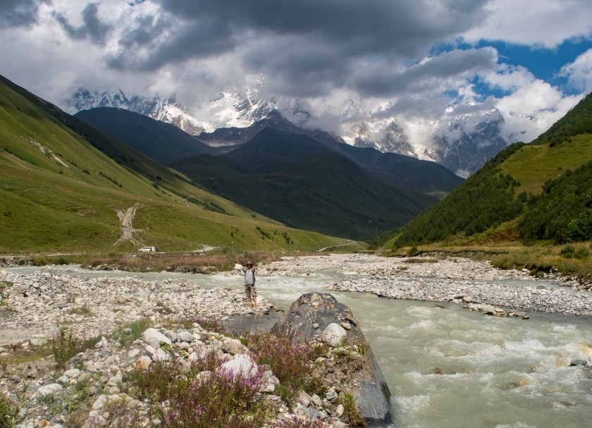 Kilkukilometrowy spacer jest absolutnie niewymagający a widoki wręcz odwrotnie proporcjonalne do wysiłku. Shkhara kryjąca się w chmurach po chwili grzejąca w słońcu to widok niezwykły – sama góra nie ma tak charakterystycznego kształtu jak Uszba czy Kazbek, ale jej monolityczna potęga (wespół z całą Ścianą Bezingi) sprawia, że szczena opada! Poza tym: to przecież najwyższe góry jakie do tej pory w życiu widziałem! I to czuć 🙂 Całą wędrówkę towarzyszy nam pieseł, wiele ich tam biega, wszystkie są strasznie przyjazne i grzechem byłoby nie pozwolić im na towarzystwo 🙂