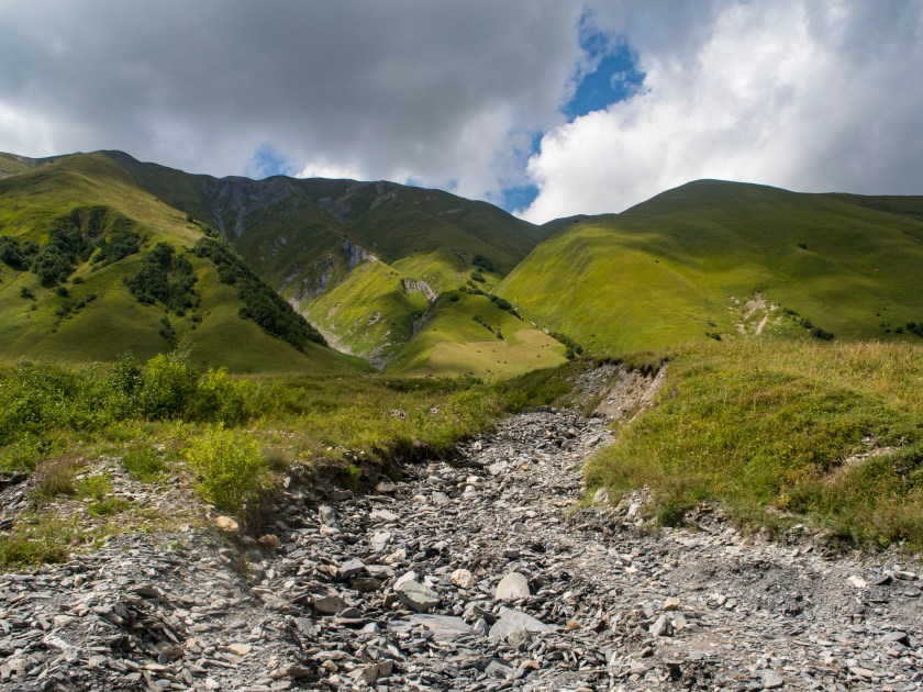 Jednak nawet mając tak mało czasu można zrobić przyjemny marsz: 1) ku lodowcowi; 2) na pobliską górkę Lamaliales. Wybraliśmy opcję pierwszą choć trekking na mierzący niespełna 3000 metrów szczyt z pewnością dostarczyłby nam widoków nie znanych z większości folderów reklamowych o Gruzji 😉