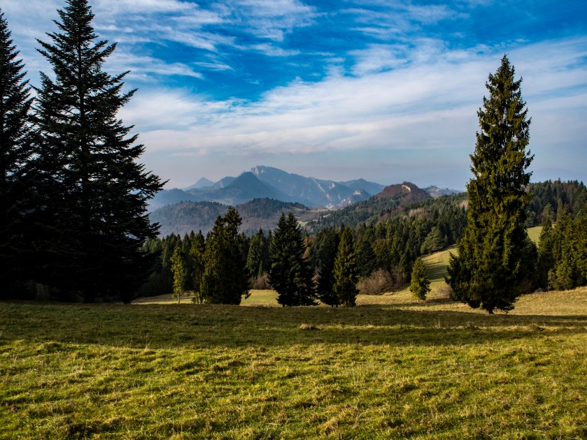 Po wyjściu z lasu pierwszy raz naszym oczom ukazuje się widok na Pieniny właściwe. Już wtedy widząc Trzy Korony wiedziałem, że będzie dobrze. Widoki ładne a my tak bardzo gadu gadu, że tuż przed Szafranówką odbijamy w lewo i spokojnie idziemy wzdłuż wydeptanej ścieżki… i dopiero po kilkuset metrach ogarniamy, że to nie dalszy szlak a stok narciarski. W tył zwrot!