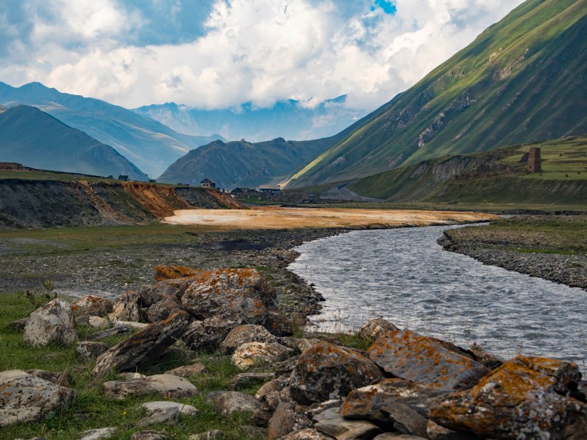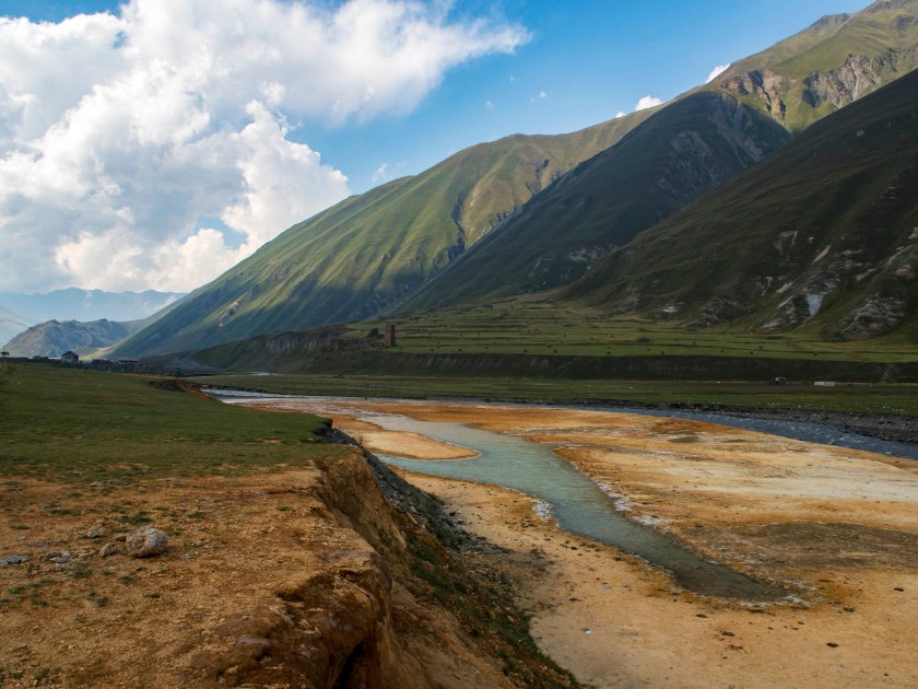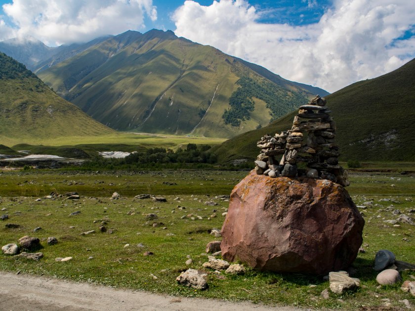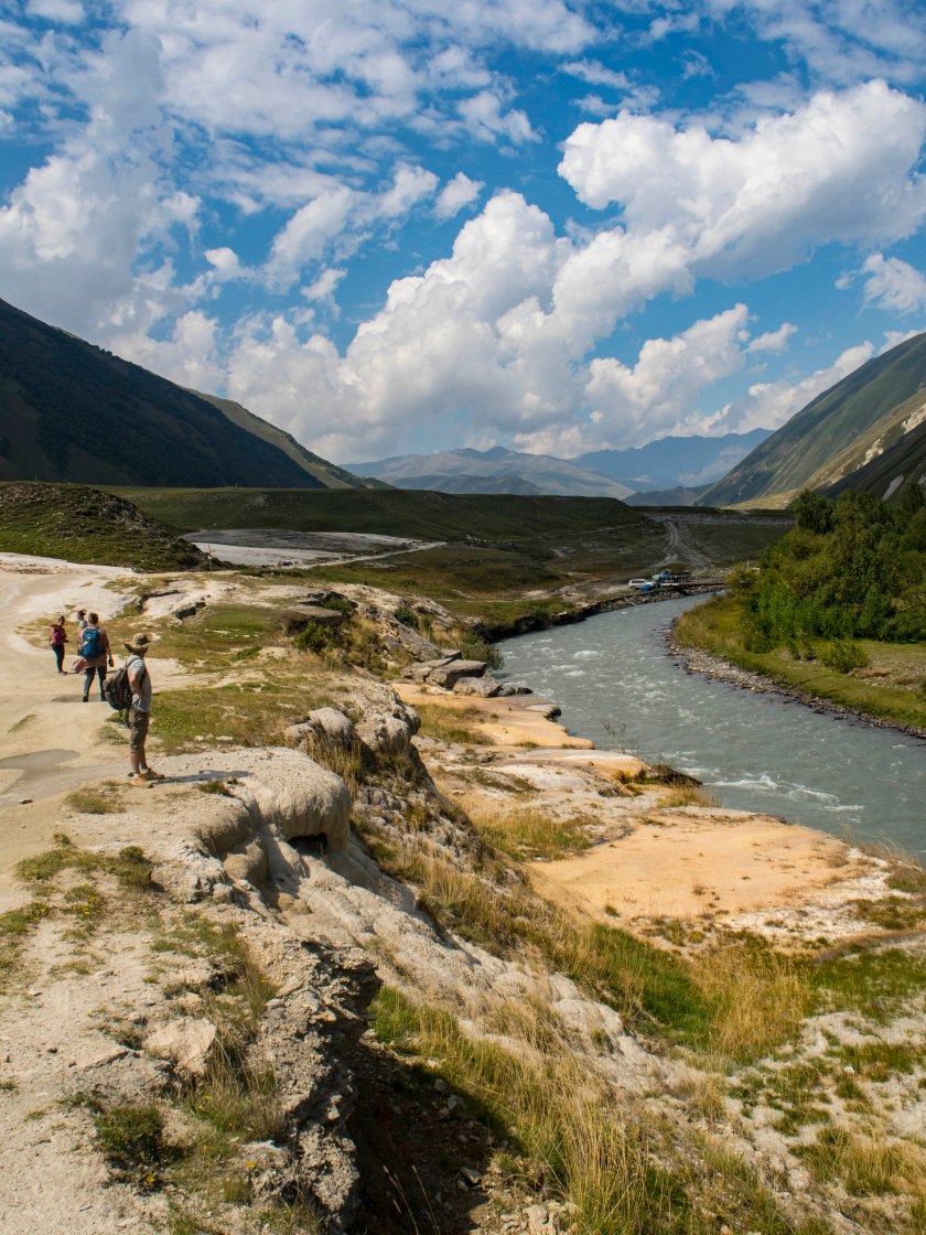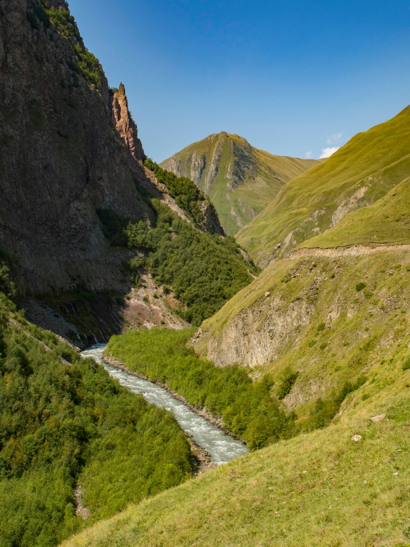 Dalej bez pozwolenia ni chu chu. A przyznać trzeba, że strefa przygraniczna ma do zaoferowania kolejne oszałamiające miejsca, wąwozy Suatisi oraz Mna (wraz z wodospadem), skalne ściany Ulchandzarau-choch oraz masywu Gimara, wulkany, jeziora Kelitsadi, o widokach na Kazbek od d..y strony nie mówiąc! Bardzo dokładnie trasę tę opisano na stronie Organizacji Turystki Górskiej z okręgu Dmitrowskiego, mnóstwo zdjęć i informacji po rosyjsku. O uzyskanie przepustki można się postarać w Ministerstwie Spraw Wewnętrznych w Tbilisi a odebrać u pograniczników w wąwozie Darialskim.