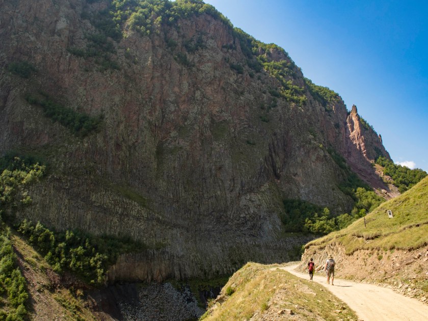 Marsz ku dolinie zaczynamy w kanionie Kasari. Niecałe 3 kilometry pośród strzelistych skalistych ścian, rzeka Terek wije się po naszej lewej.