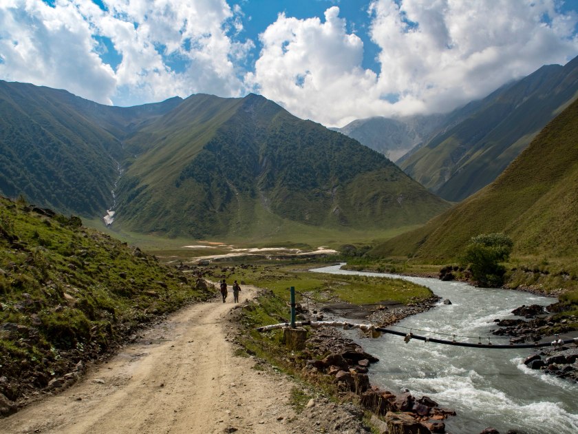 Jeszcze do niedawna dostanie się tam było nie lada wyczynem, znaczy się aż tak trudny nie był sam dojazd bo zawsze znalazł się ktoś chętny do podrzucenia – jedynie portfel bardziej na tym cierpiał. Do doliny nie kursują marszrutki, taxi kosztuje niemałe pieniądze, miejscowi ze Stepancmindy co i rusz proponują podwózkę… Jednak lat temu kilka grupa zapaleńców, pasjonatów ale i profesjonalistów – Polaków (Polek w dużej mierze!) i Gruzinów założyło agencję górską Mountain Freaks, oferującą szereg różnorodnych aktywności w Gruzji (i krajach ościennych). Jedną z nich jest codzienny transport w najbardziej interesujące miejsca okolicy w tym do doliny. Dzień w dzień, o godzinie 9.30 oraz 11.00 busiki zawożą chętnych przygód… na przygodę w pełnym tego słowa znaczeniu! Kurs w dwie strony kosztuje 30 lari a na miejscu mamy do dyspozycji 6 godzin, które w zupełności pozwalają na pokonanie całej trasy i z powrotem. No to jedziemy!