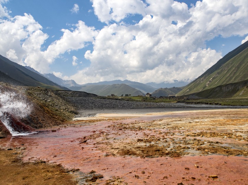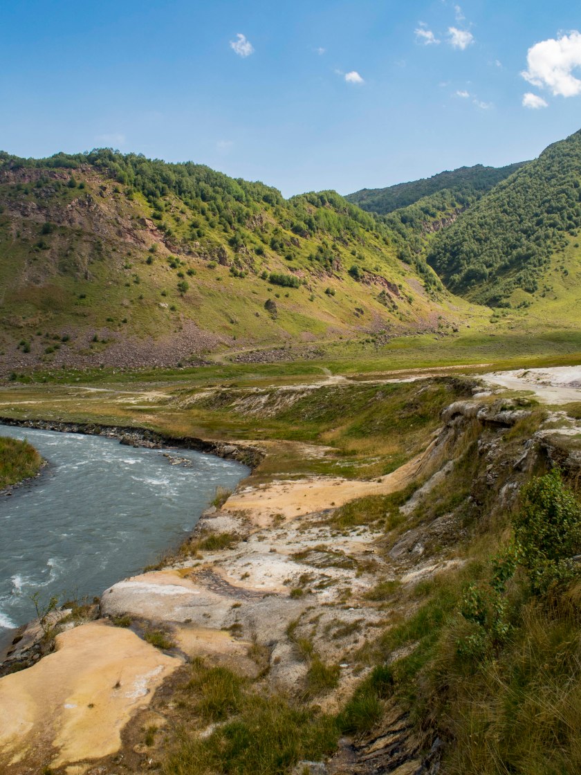 Czerwonawe głazy znaczą drogę. Na odległych diablo zielonych górskich zboczach dają się zauważyć pierwsze trawertyny tamtejszych mineralnych źródeł. Odchodzimy na chwilę od Tereka by po chwili wrócić nad rzekę w miejscu gdzie ostro zakręca ku finalnemu i najważniejszemu fragmentowi doliny. Trawertyny robią tam niesamowite wrażenie, białe skały spotykają się z rzeką, tworząc świetną mozaikę kolorów.