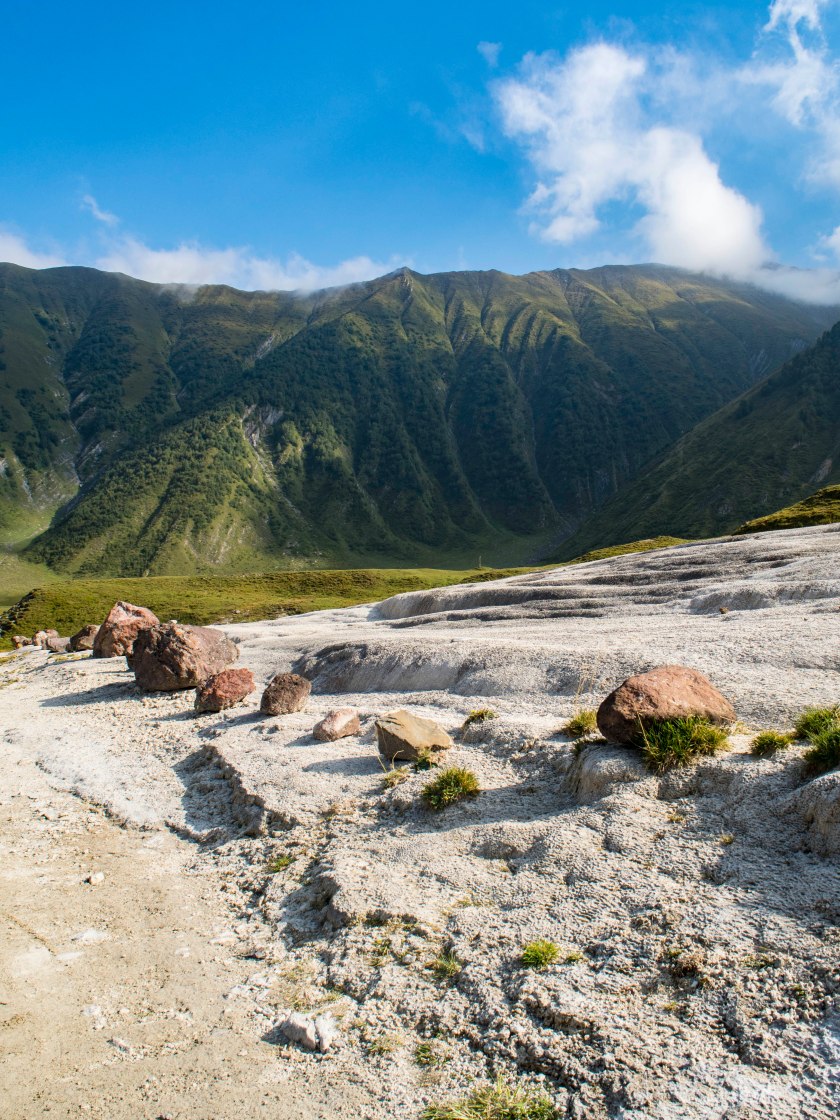 Wychodząc na wściekle zielone łąki powoli wspinamy się na niewielkie wzniesienie za którym szczęka może opaść. Oto przed naszymi oczami otwiera się calutka dolina, pomarańczowo-czerwone trawertyny nie tylko rzucają się w oczy, ale i dają o sobie znać poprzez siarkowe delicje zapachowe 😉