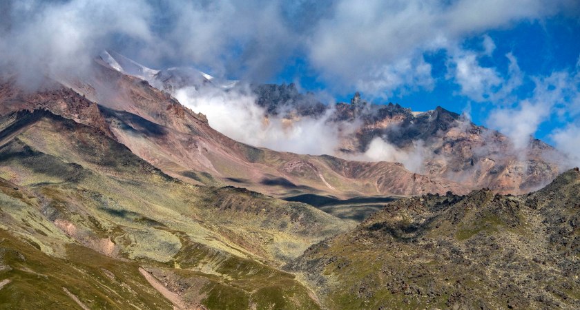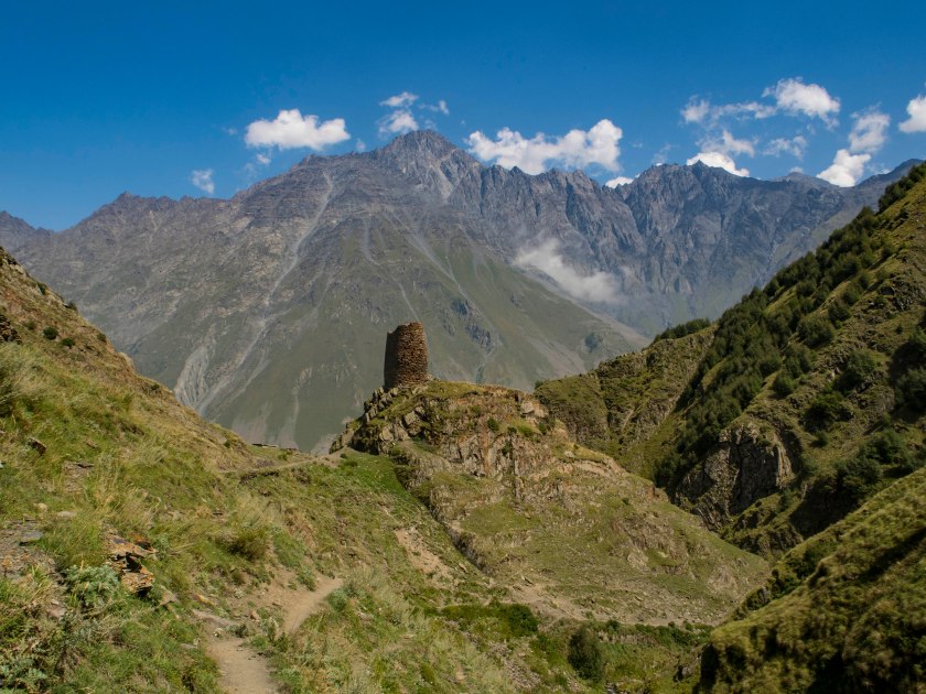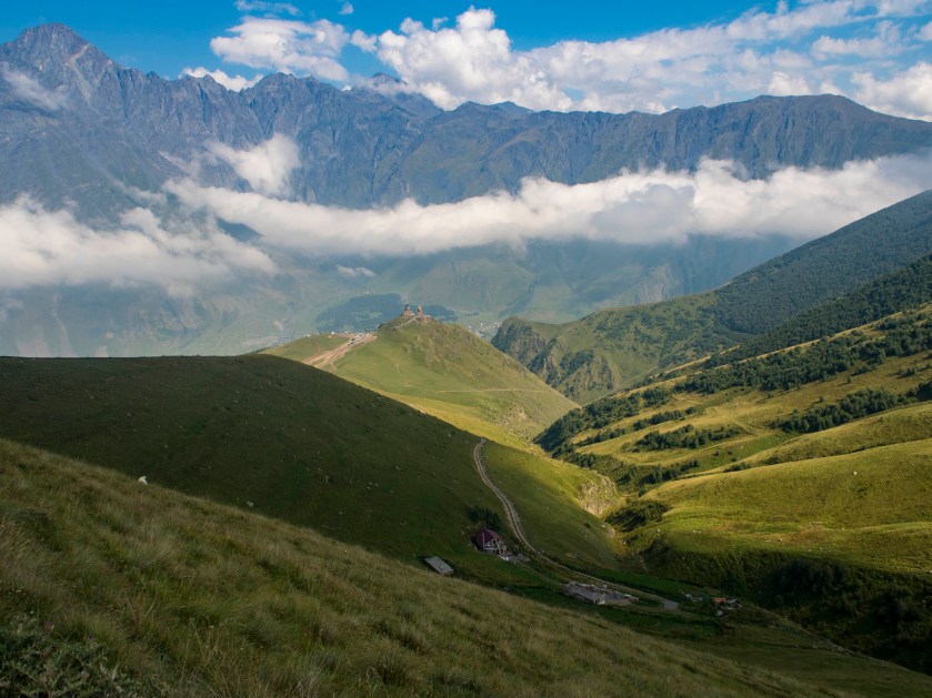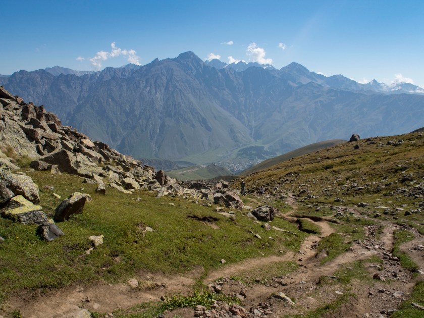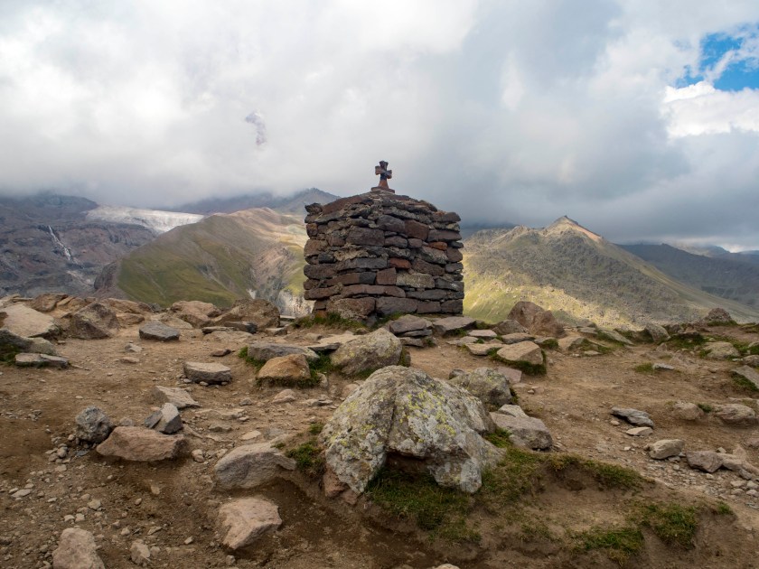 Nie wiem czy tylko ja tak mam, ale widok z przełęczy na Kazbek, lodowiec Gergeti oraz Ortsveri odebrał mi mowę – w tak wysokich górach samemu będąc na takiej wysokości jeszcze nie byłem. Kolory wulkanicznego kolosa, biel lodowca, błękit nieba – wszystko tworzyło tak niemożliwą mozaikę, że ja cię! Chmur na niebie niebezpiecznie przybyło, ale pięciotysięcznik tylko zyskał w ich towarzystwie 🙂