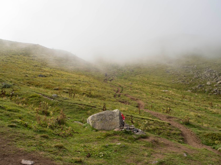 Z każdym metrem poziom chmur się obniżał i tak na wysokości tabliczki upamiętniających trzech Polaków, którzy zginęli podczas wchodzenia na szczyt robimy stop. Miejscu na tyle szczególnym bo do tamtej pory podejście wydawało się banalnie proste i tablica przypomina, że jest się na granicy naprawdę wysokich gór i nawet na chwilę, nie można o tym zapomnieć.