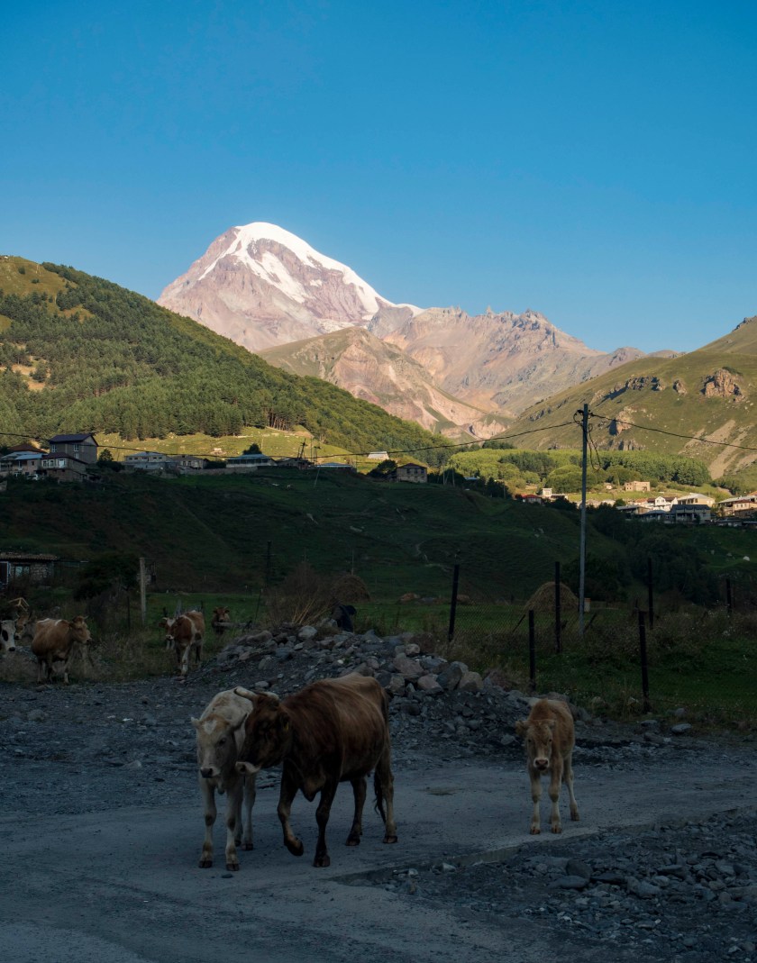 Ostatnie metry przed Stepancmindą. Mijamy kilka krów, po mojej prawicy przez okno widać rozpogadzające się niebo, zaraz zobaczymy Kazbek, ekscytacja poziom over 9000. Zatrzymujemy się i pierwsze co robię to z bananem na twarzy zwracam się w stronę granicy z Rosją.