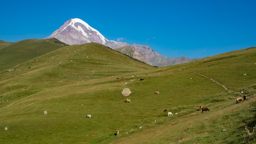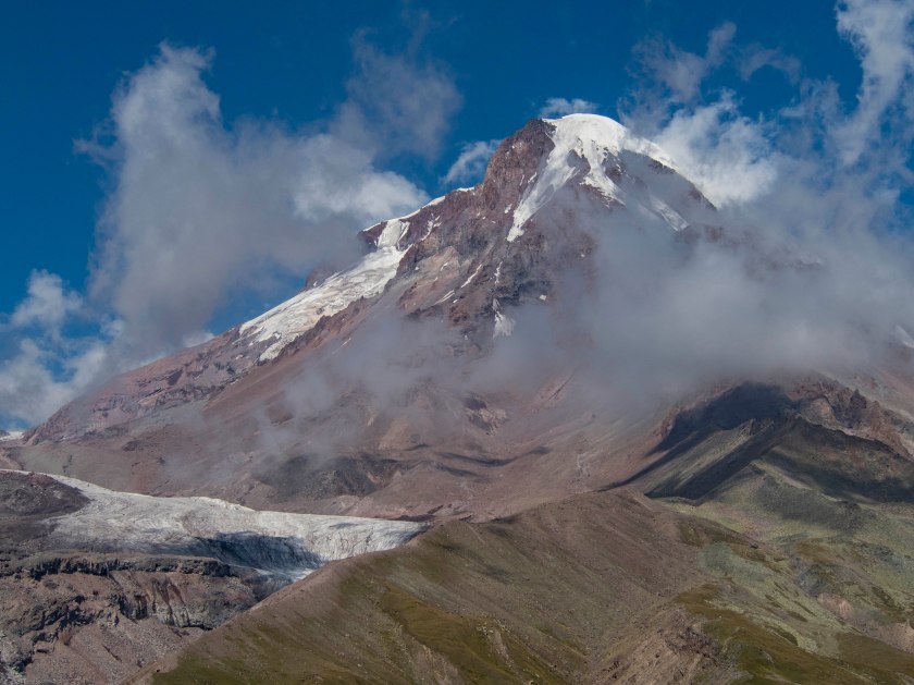 Kazbek. 5033 metry potęgi i majestatu. „Dopiero” siódmy najwyższy szczyt Kaukazu, jednak ze względu na otoczenie jeden z najbardziej wybitnych i wyróżniających się z tłumu. Piękny, ale i wymagający, niby bliski, ale i daleki. Jeśli podejdziesz do niego z należytym szacunkiem masz szansę na wielką przygodę, którą będziesz wspominał długo 🙂