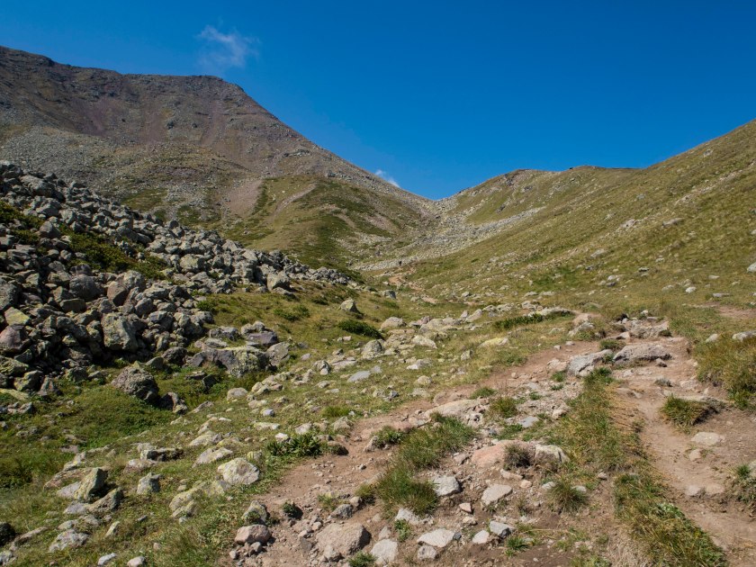 Szybko osiągnęliśmy tablicę pamiątkową. Nasze rozkminy „jak daleko do przełęczy?” dość szybko idą do kosza, okazuje się, że jeszcze trochę metrów było. Nienazwany trzy wierzchołkowy szczyt wskazuje nam drogę, nie jest ciężko choć znacząco pod górę. Ścieżka robi się oraz bardziej piaszczysto-kamienista, obrosłych porostami głazów też zresztą więcej.