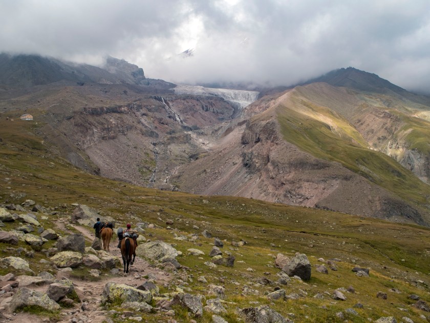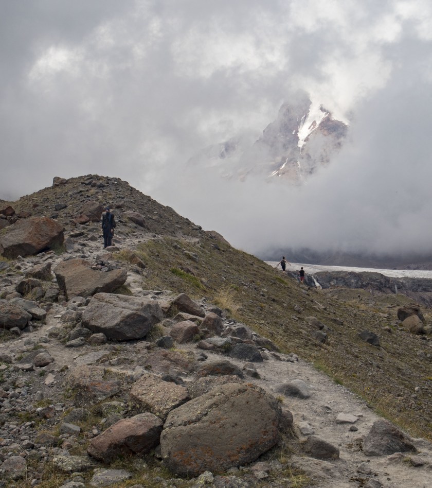 Warunki nad Kazbekiem rypią się całkowicie, calutki lodowiec niknie w gęstych ciemnych chmurach co mówi nam jasno: spadajcie! Na szczęście jednak towarzystwo rok w rok cofającego się Gergeti pasuje chmurom i te pozostają na jednym pułapie już do końca dnia, przez co szybko orientujemy się, że na łeb na szyję gnać nie musimy.
