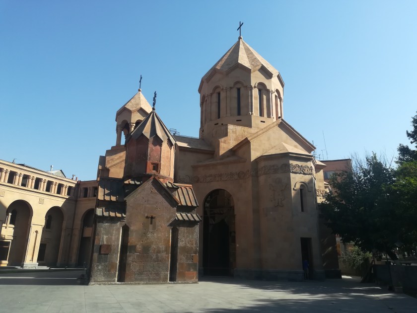 Wśród drzew ulicy Abovyana – jednej z nielicznych na której zachowało się kilka starszych budynków – dochodzimy do najstarszego w mieście kościoła, Kathogike. Jego historia jest zaskakująca. Kiedy w latach 30 XX wieku w ramach rozbudowy centrum chciano wyburzyć stary kościół katedralny, w czasie robót rozbiorczych odkryto, że to co brano wcześniej za apsydę było osobnym niewielkim i starszym kościołkiem, pochodzącym z bagatela XIII wieku. Wskutek protestów nie wyburzono go i stoi na swoim miejscu do dziś (w asyście nowej świątyni).