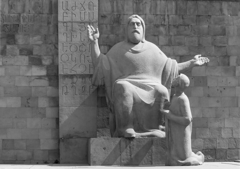 Naturalną koleją rzeczy byłby marsz „cały czas do przodu” ku Kaskadom, lecz my skręcamy w gwarną Aleję Mesropa Masztoca. To postać w Armenii niezwykle ważna, duchowny i uczony, twórca ormiańskiego alfabetu, święty tamtejszego kościoła. Koniec alei zwieńczony jest Matendaranem, monumentalnym wykutym w skale repozytorium ormiańskich pism i rękopisów, najstarszych pochodzących z V i VI wieku, czyli sz amych początków ormiańskiego alfabetu. Zbiór kilkunastu tysięcy rękopisów, inkunabułów, tekstów wykutych w skale czy wyrzeźbionych w drewnie jest skarbem narodowym – wśród wszystkich ich najważniejszym jest Kodeks Eczmiadzynski.