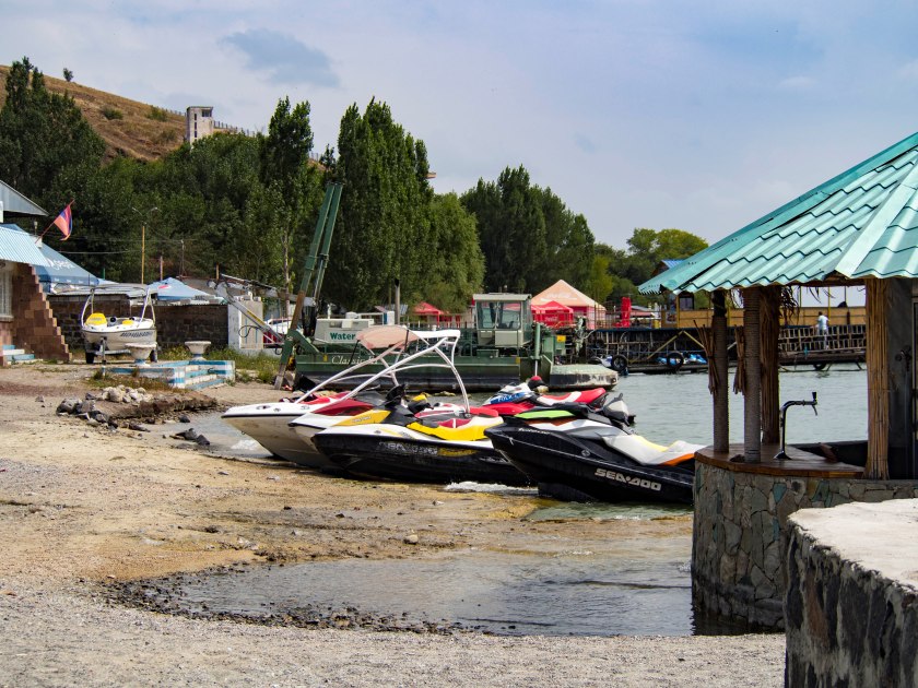 Mimo dogodnego położenia nie nazwałbym Sewanu i okolic rekinami biznesu turystycznego… choć starają się jak mogą. Tak jak położone dalej postindustrialne miasto (a na pewno jego centrum) wydaje się być turystyką mało zainteresowane tak nad jeziorem znaleźć można hotele, plaże, boiska do siatkówki plażowej, beach soccera, wiele basenów, kilka restauracyjek czy budek z przekąskami (częściej). Plaże są w większości jednak prywatne z płatnym wstępem rzędu 1500-2000AMD. Co ciekawe jednak była sobota a plaże owe świeciły pustkami. Prócz nas i kilku rodzin w pobliżu plaży byli tylko… senator PO Jan Filip Libicki i ambasador Polski w Armenii. Taka sytuacja. Ciszę i spokój jedynie raz po raz zakłócały skutery wodne – chyba najpopularniejsza rozrywka w okolicy. Wypożyczalni jest kilka a amatorów nie brakuje.