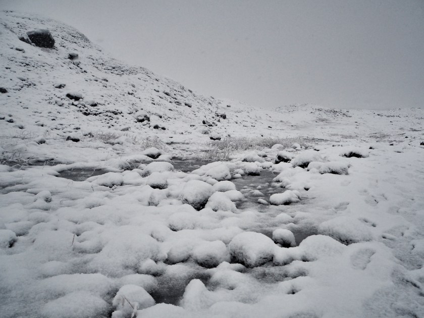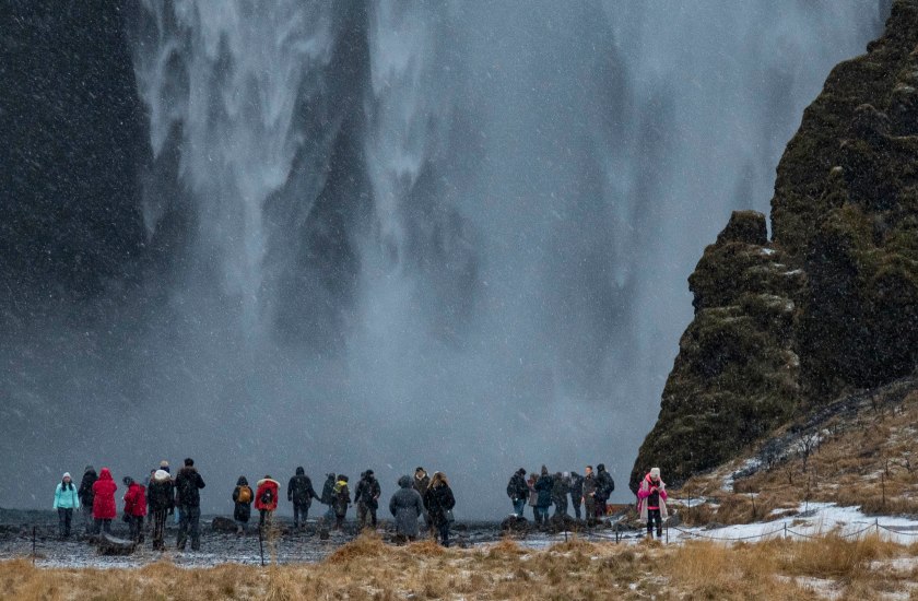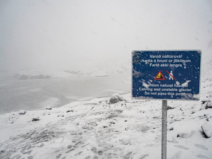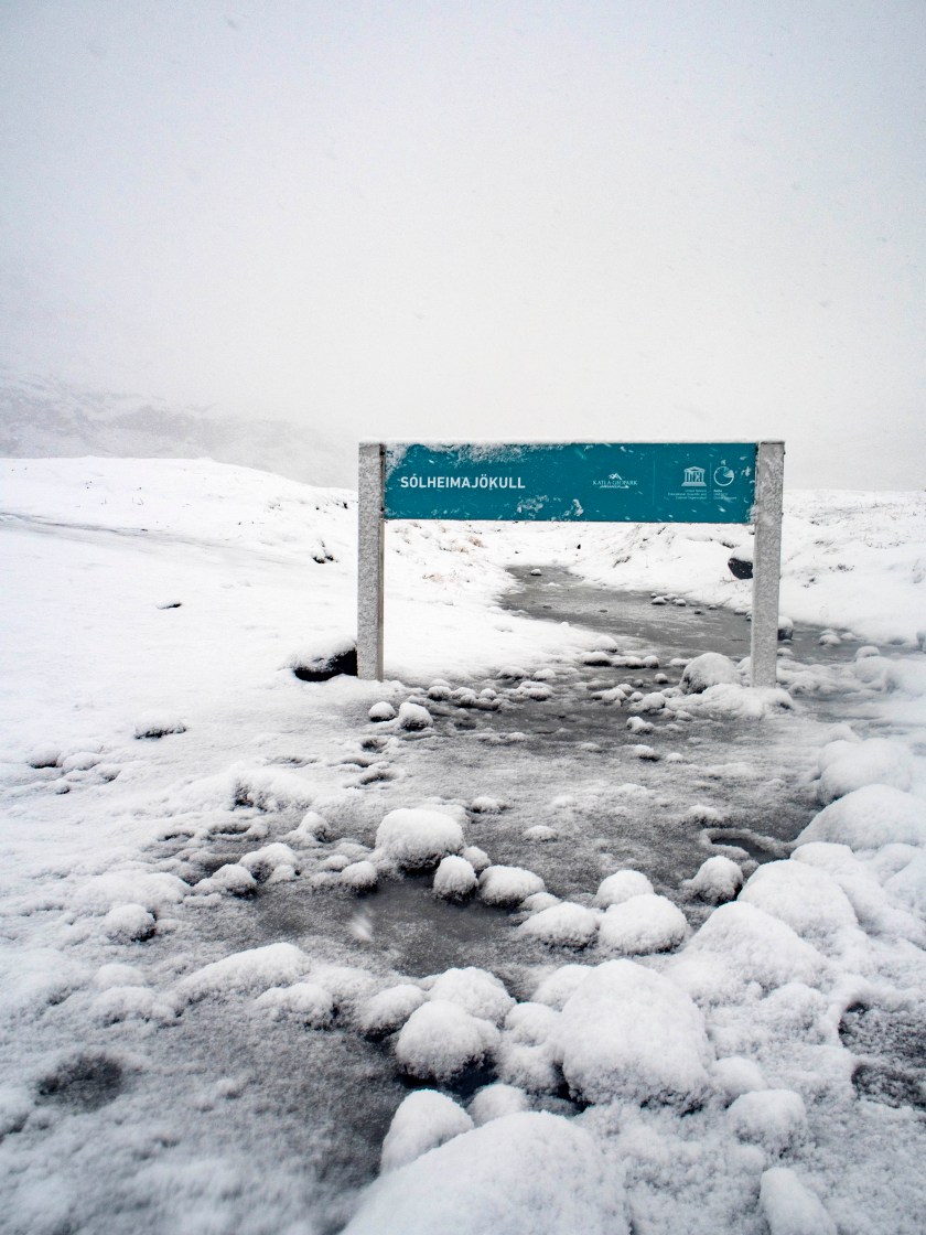 Turystyka lodowcowa jest na Islandii niesamowicie rozwinięta, nie ma się zresztą co dziwić, to tam znajdują się największe w Europie lodowce. Solheimajökull jest chyba – moim laika zdaniem – najłatwiej osiągalnym i doświadczalnym lodowcem kraju. Po dotarciu do kafejki i parkingu ewakuowaliśmy się z autobusu i ruszyliśmy ścieżką do czoła lodowca. Gęsty śnieg nie ułatwiał widoczności, o jakimkolwiek śladzie lodowca można było pomarzyć – niech tylko fakt, że staliśmy 50 metrów od czoła i juha widzieliśmy powie wam jak dobre warunki nam towarzyszyły. A szkoda, bo choć lodowiec z roku na rok się cofa to widoki i tak wciąż wydają się być „szczękoopadowe”.