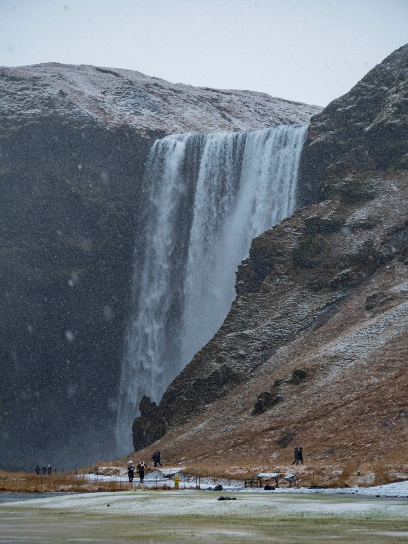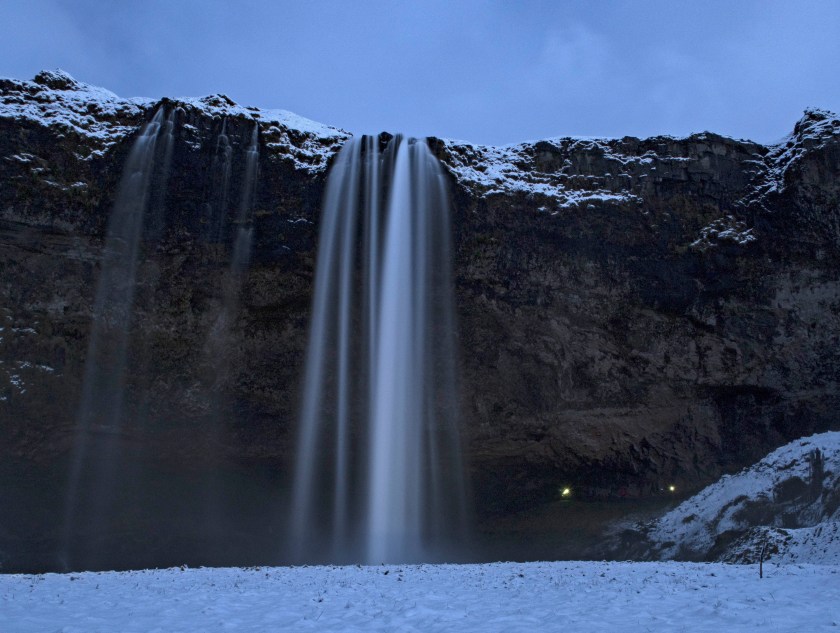 Seljalandsfoss mijaliśmy wcześniej tego dnia, jednak rankiem tylko mignął nam po drodze. Teraz jako wisienka na torcie kaskada czekała na nas cała przykryta białym puchem, kilka godzin wcześniej cała okolica mieniła się jeszcze rdzawymi trawami.