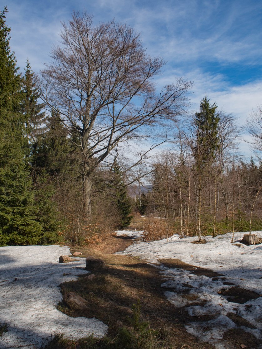 Sinusoidalny szlak pozwala nam na „zdobycie” kolejnych niewysokich szczytów, naszym łupem padają Javorovy Vrch, Certuv Vrch, Jedlovy Vrch, Kropiwiec. Warunki w dużej mierze wiosenne, jednak gdzieniegdzie jeszcze leżało sporo śniegu – intensywna zieleń iglaków jasno obwieszczała zmianę pór roku, jakże inaczej prezentowały się „łyse” wciąż buki. O nadchodzącej wiośnie przypominały też zauważalne raz po raz śnieżyce wiosenne.