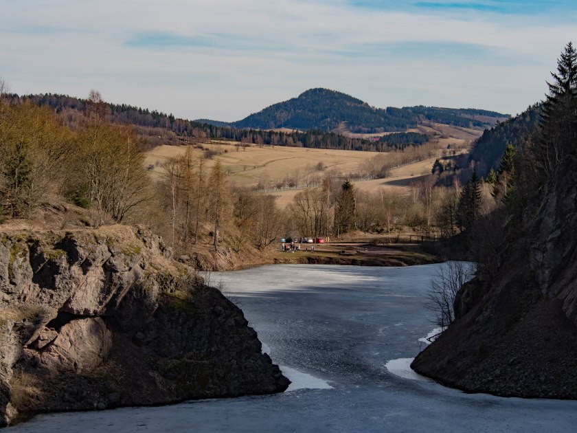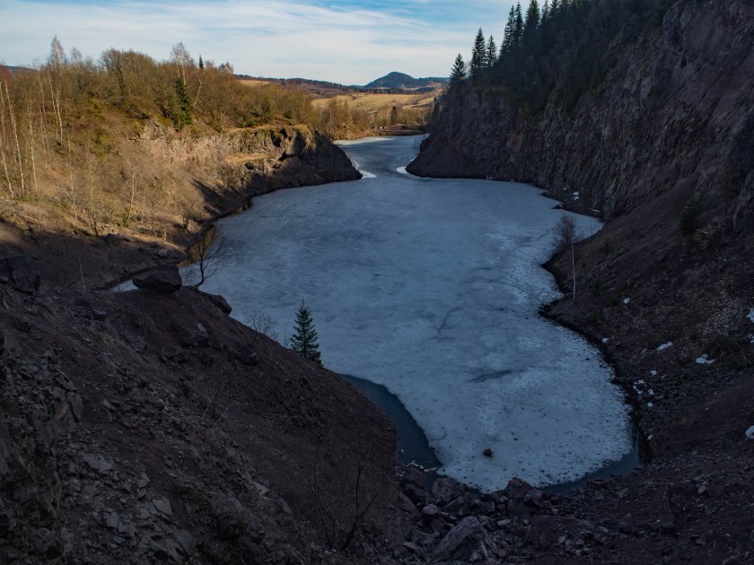 Wokół mieniącego się turkusem (lub bielą zimą) jeziorka poprowadzono ścieżkę, tak biegnącą wzdłuż brzegu jak i wysokich ścian zakończonych punktem widokowym, z którego widać tak akwen jak i górującą nad horyzontem Włodzicką Górą. Szlak nie jest w żaden sposób zabezpieczony, wystarczy jednak zachować zdrowy rozsądek i nie zrobi się fikołka w dól 😉 Niedaleko wśród drzew znaleźć można porośnięte już mchem pozostałości po budynkach kamieniołomu.
