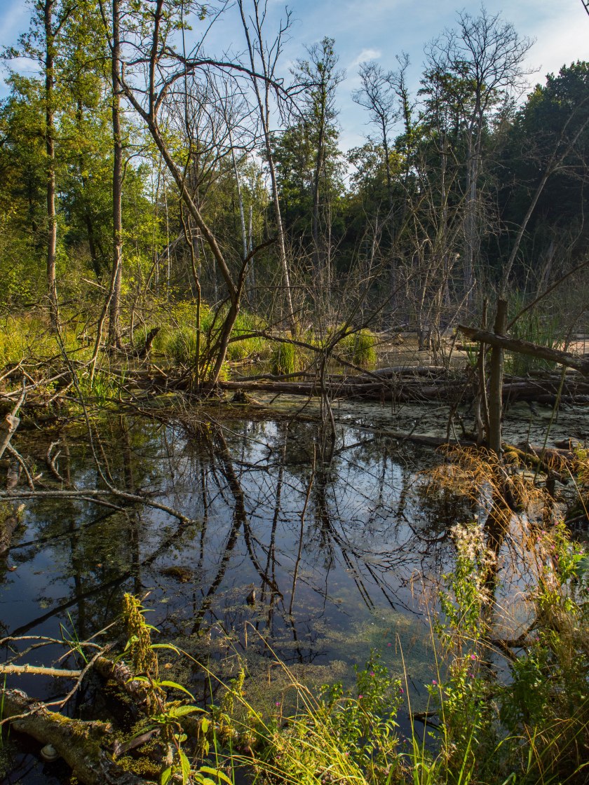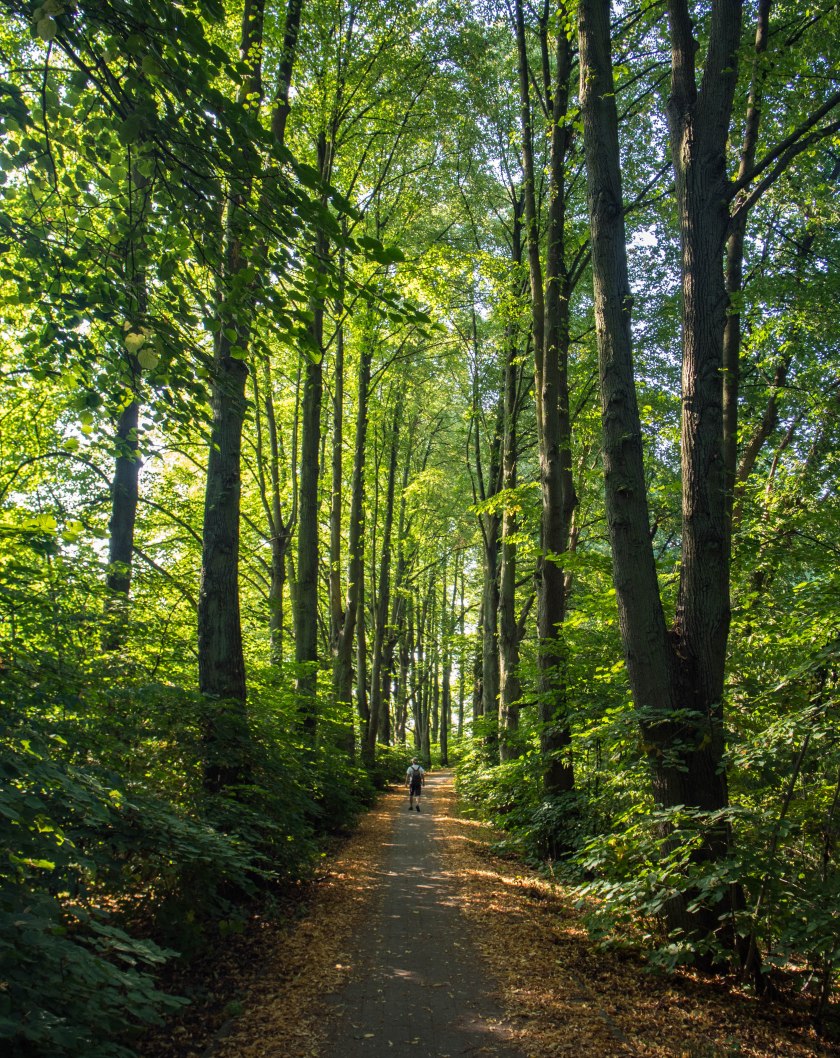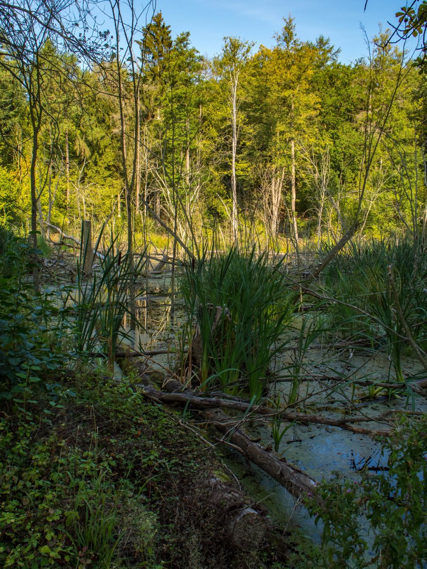 Jest on piękny, dęby, olchy, buki, jesiony – od wyboru do koloru. Wędruje się bardzo przyjemnie… no chyba, że zachce się się zatrzymać celem np. zrobienia zdjęcia. Wtedy to dosłownie w sekundę trylion komarów pojawia się znikad i atakuje zaciekle – pamiętajcie więc, środek na komary miejcie ze sobą. Inaczej będziecie wyglądać jak ja robiący zdjęcia, pląsający by jak najmniej owadów mogło „wylądować”.