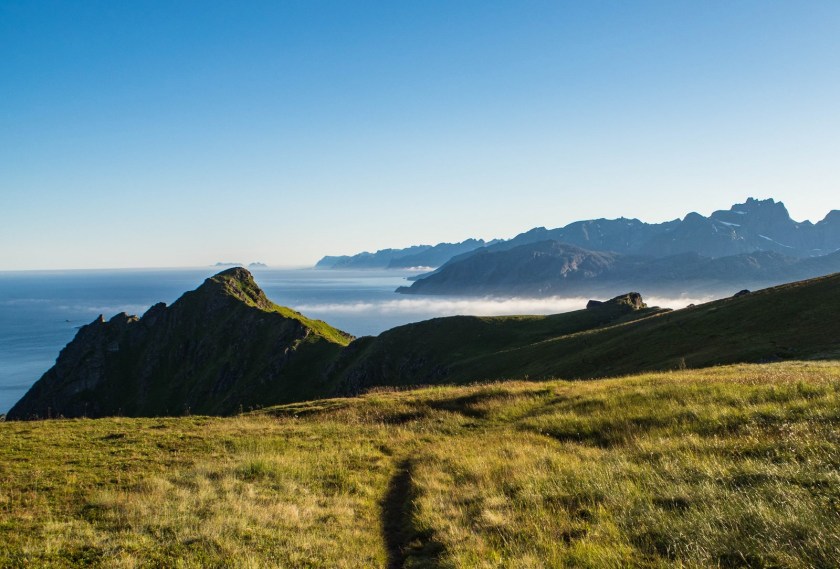 Po 300 metrach forsownego podejścia osiąga się wymarzoną przełęcz, z której widok dość mocno urywa 4 litery: Flakstadøya i Moskenesøya są na wyciągnięcie ręki a na horyzoncie można też zauważyć samotną Værøyę w towarzystwie charakterystycznej Mosken. Co więcej, wystrczyło się obrócić by zacząć podziwiać wschodnią część Lofotów.
