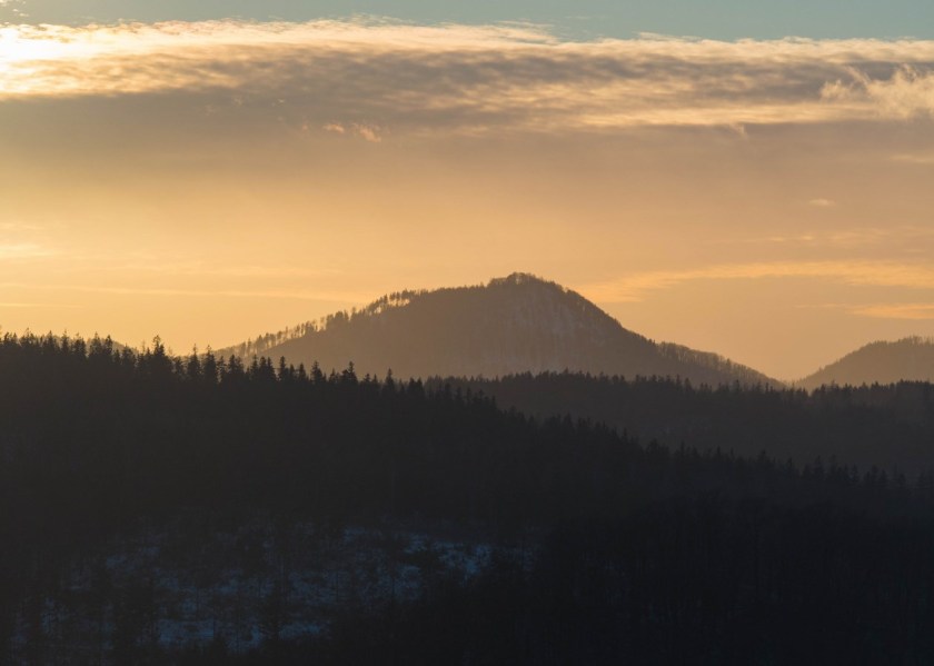Po niespełna kwadransie i pola zostają w tyle. Zaczyna się powolne, spokojne podejście lasem. A tam z każdym krokiem więcej śniegu, w końcu można było poczuć, że to zima. Heloł! Romans ze szlakiem zielonym kończy się na polance z ogrodzeniem, odbijamy w lewo i kontynuujemy niewymagające podejście. Z każdym jednak krokiem nachylenie robi się coraz większe a pagór zdaje się nam delikatnie przypominać, że jesteśmy w „krainie srogich podejść, których człowiek się nie spodziewa”.