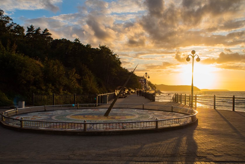 Bardzo fajnie prezentuje się mozaikowy zegar słoneczny na wschodnim krańcu promenady. Odwiedźcie to miejsce wieczorem, rozsiądźcie na ciekawych dość ławkach i podziwiajcie zachód słońca. Efekt wow gwarantowany. Co ciekawe zegar jest tak leciwy… że chyba wymknął się konstytucyjnym zabawom z czasem przeprowadzonym przez wiecznego Władymira, przez co śpieszy się o 2 godziny 😀
